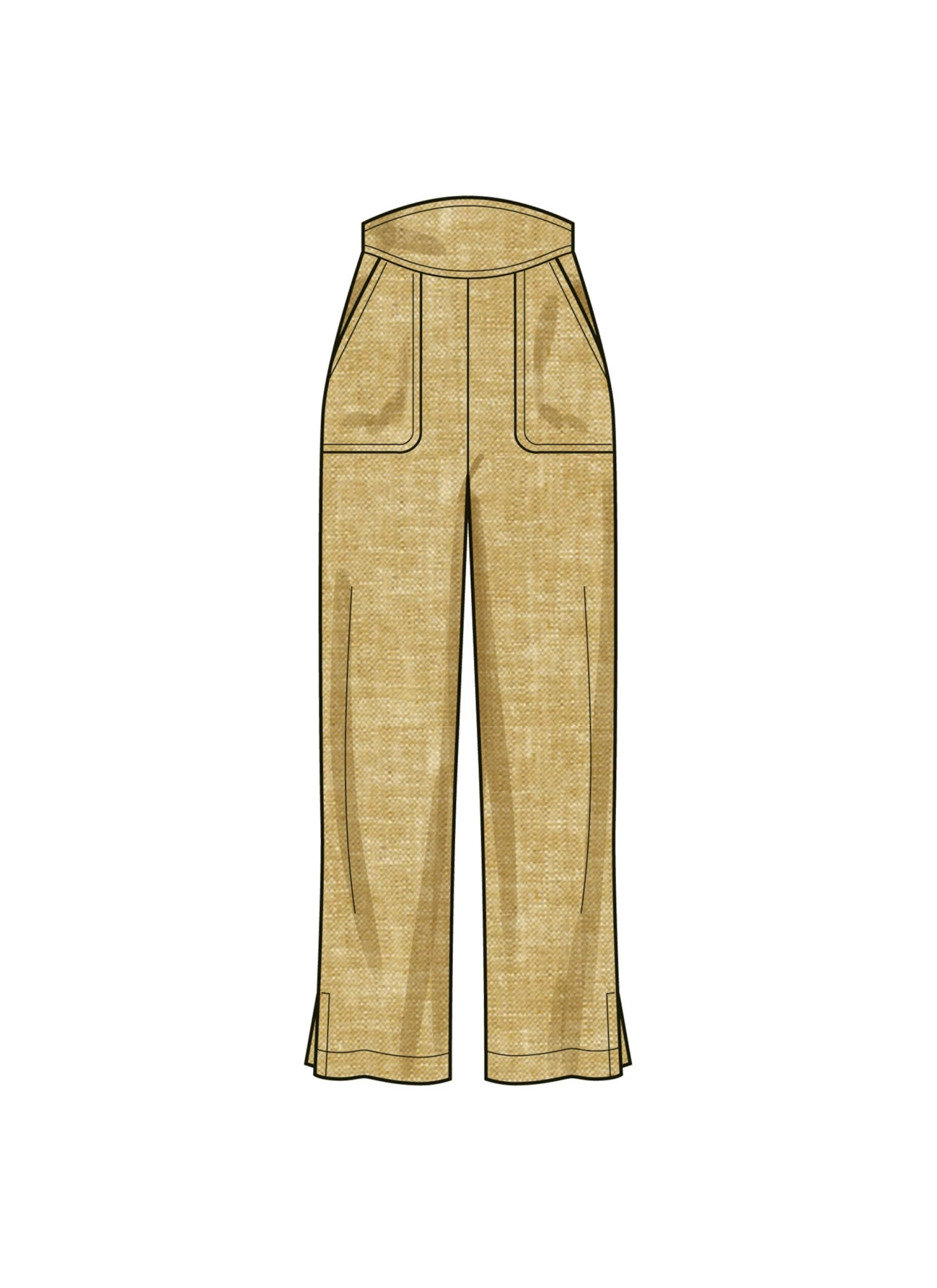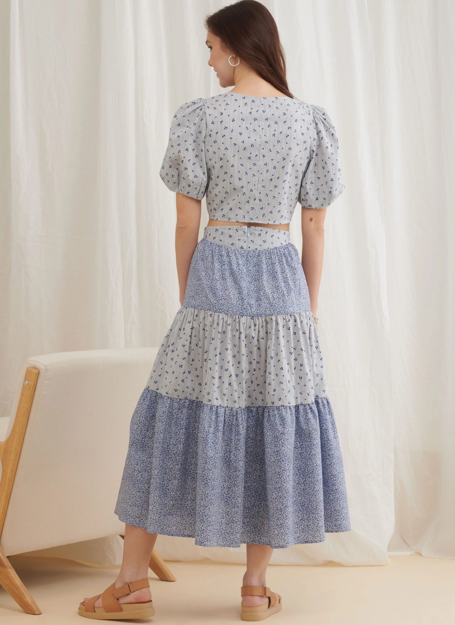 Simplicity sewing pattern for Easy to sew tops, skirt and pants. Cropped top sleeveless or with puff sleeve have button front closure and darts for shaping. Three tiered skirt and pants with pockets have shaped waistband and invisible zipper.