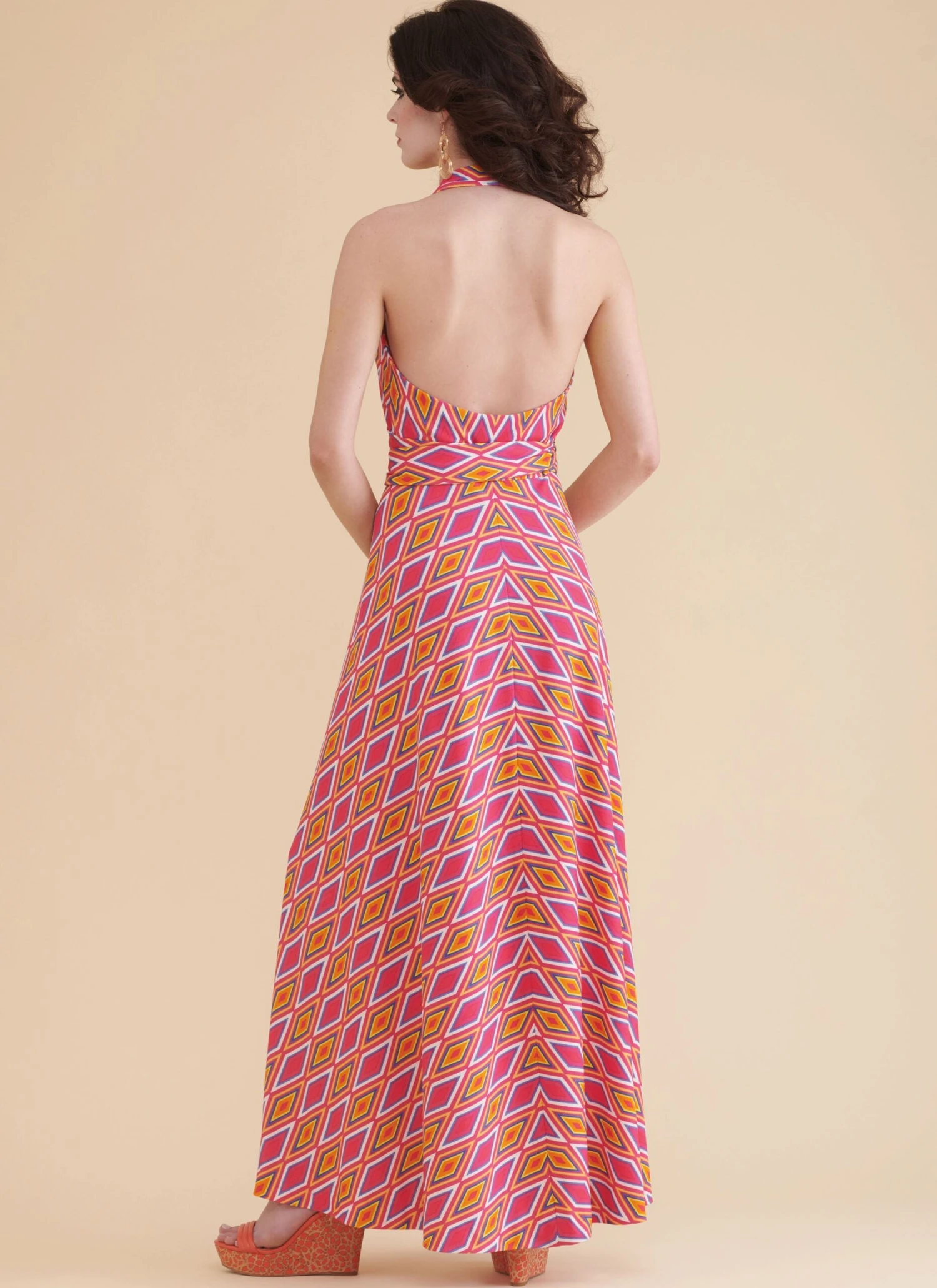 Simplicity sewing pattern for Vintage 1970’s Jiffy simple-to-sew knit front wrap long or short halter dress has flared skirt stitched to bodice with soft tucks and self-fabric tie ends. Short dress is mini length. Long dress is ankle length. Sized for stretch knits only. Authentic Vintage Reproduction includes additional size options and cutting layouts.