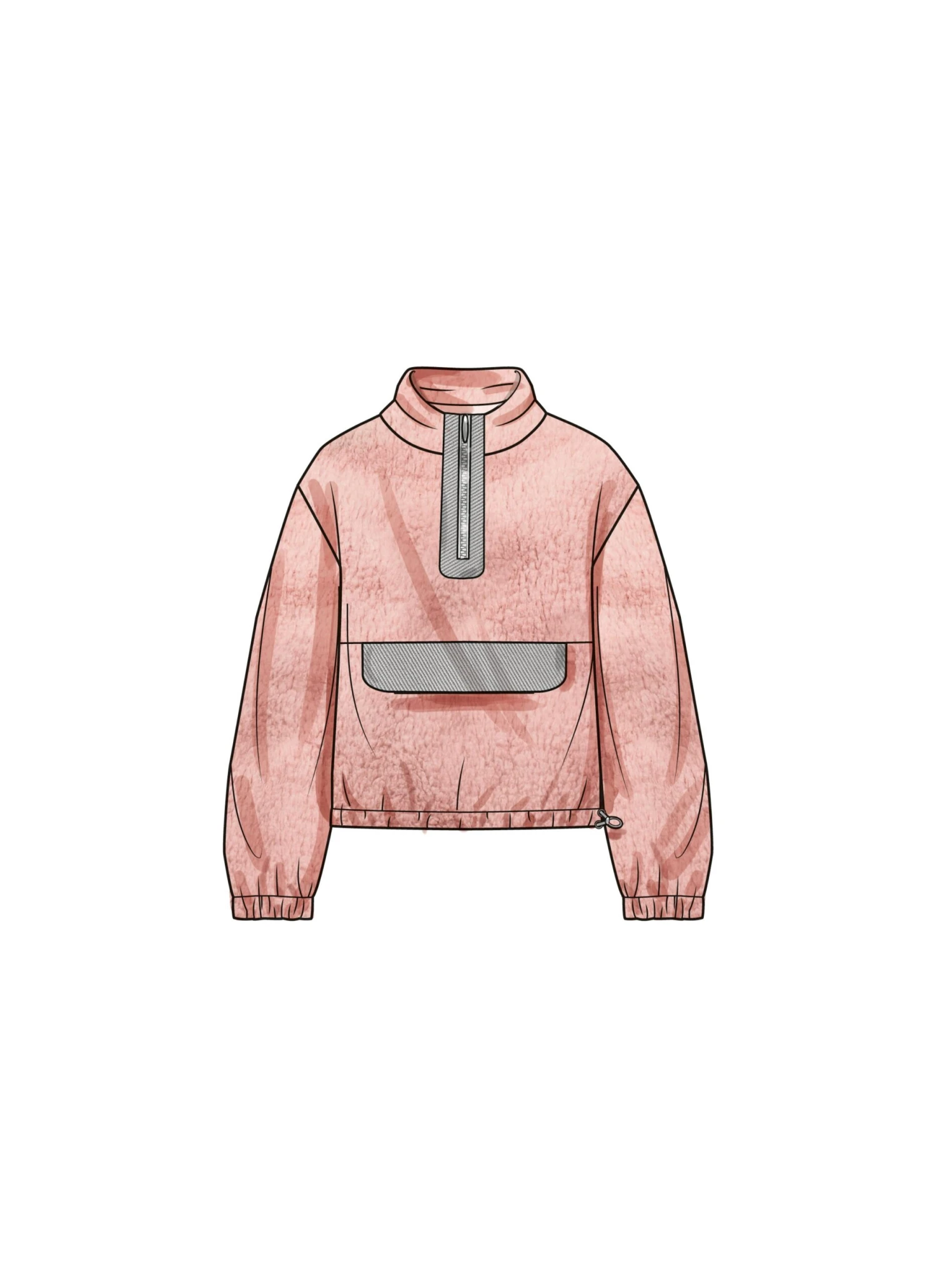 Simplicity sewing pattern for Front half zip sweatshirt has dropped shoulders, long elasticized sleeves, elastic cord at the waist and front pocket with contrast flap. Pull-on track pants have tie cord and elastic at waist and hem plus two cargo pockets with zipper.