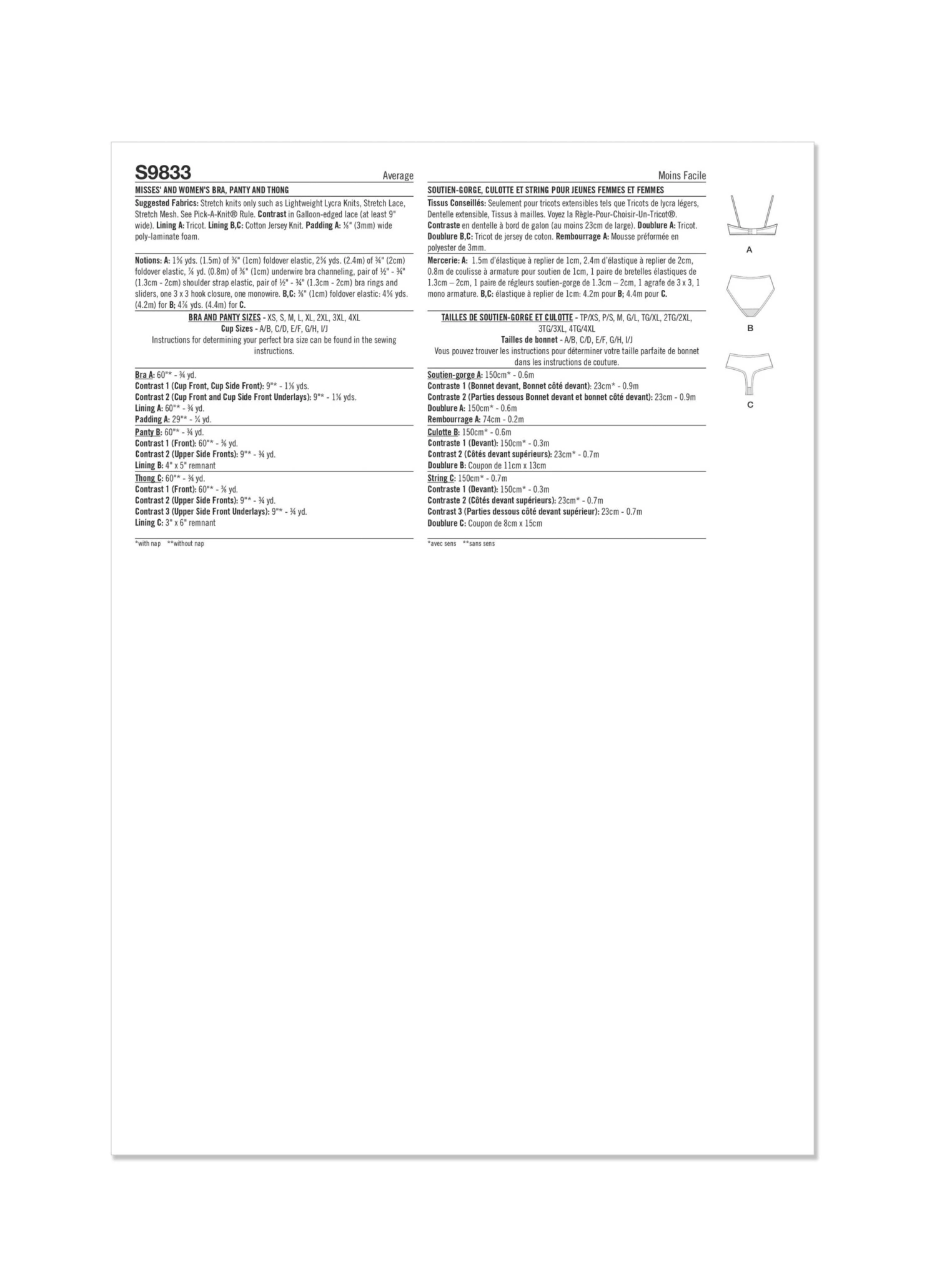 Simplicity sewing pattern for Bra with adjustable straps, monowire, back bra hook closure and lightly padded quarter cups has layered stretch lace details in cup sizes A through J. Full coverage panty and thong with layered stretch lace details, peekaboo front cutouts and contrast front in sizes XS to 4X. See envelope for more information.