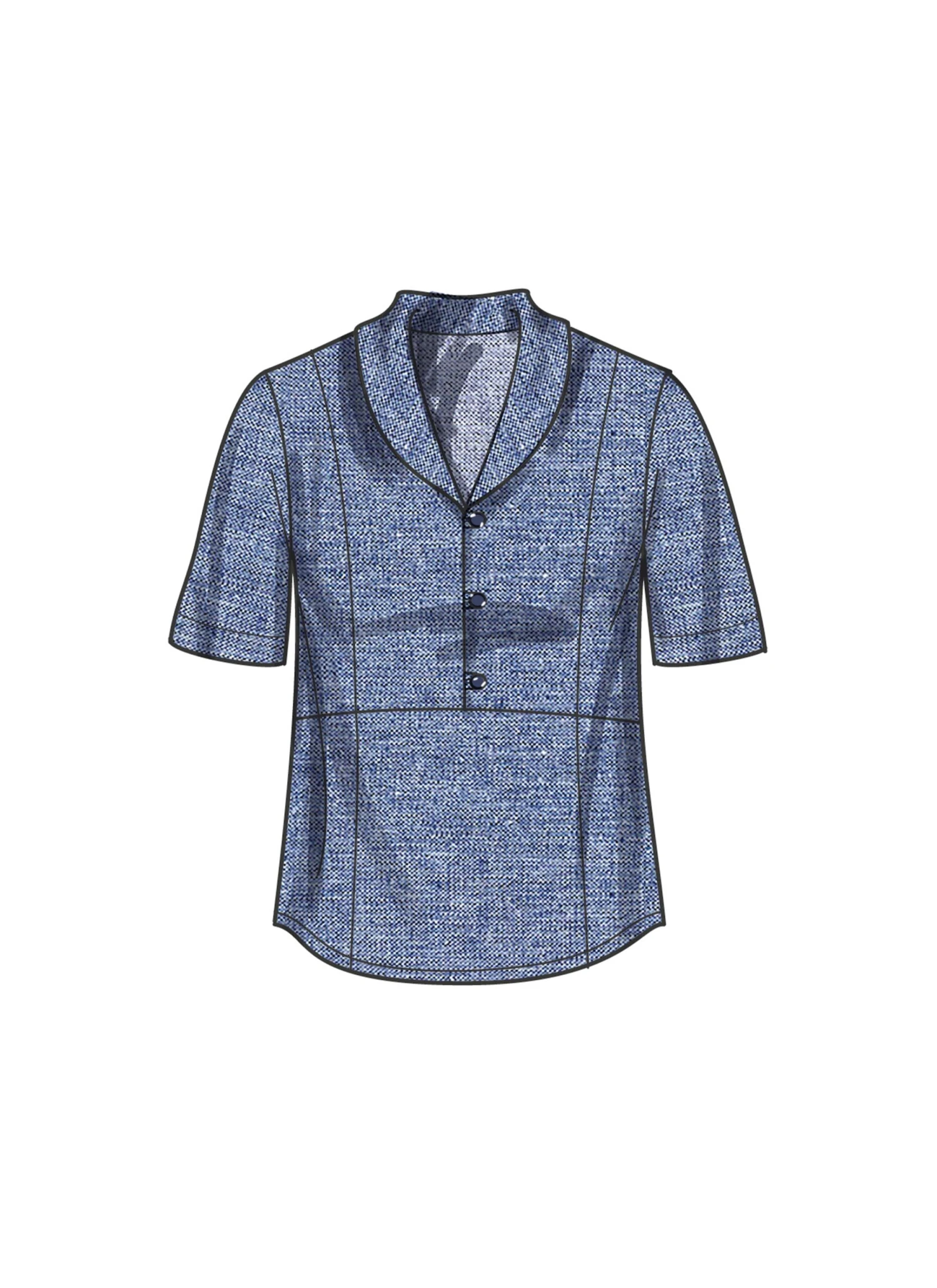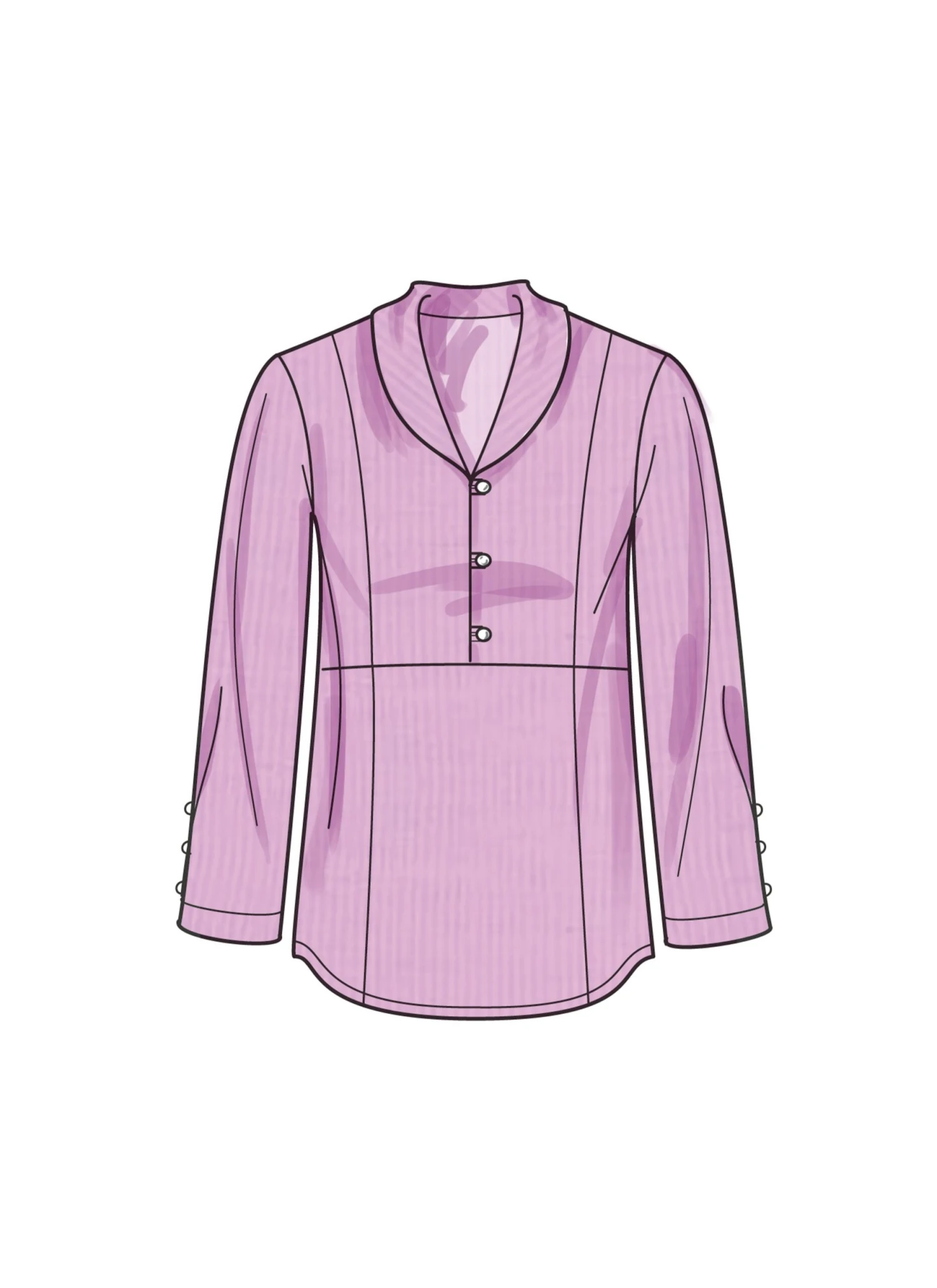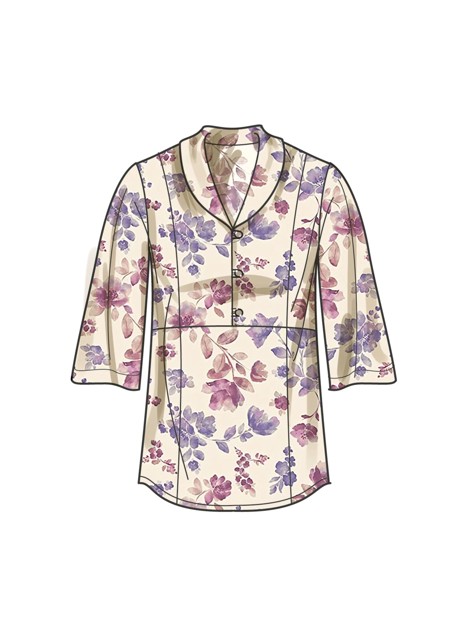 Simplicity Sewing Pattern for Raised waist tops with shawl collar have partial button front, two length options and sleeve variations. Top C has a released pleat on the sleeve.