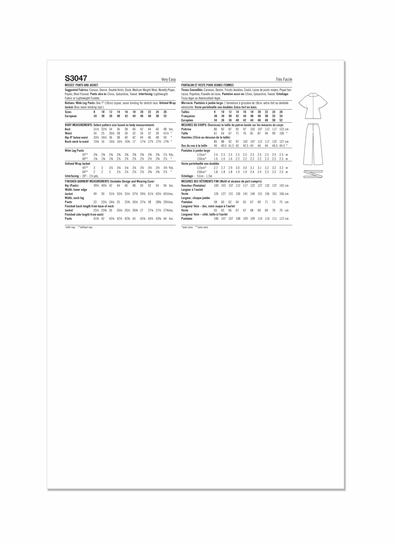 Fabric Suggestion : Canvas, Denim, Double Knits, Duck, Medium Weight Wool, Novelty Pique, Poplin, Wool Flannel. Pants also in: Chino, Gabardine, Tweed.Â