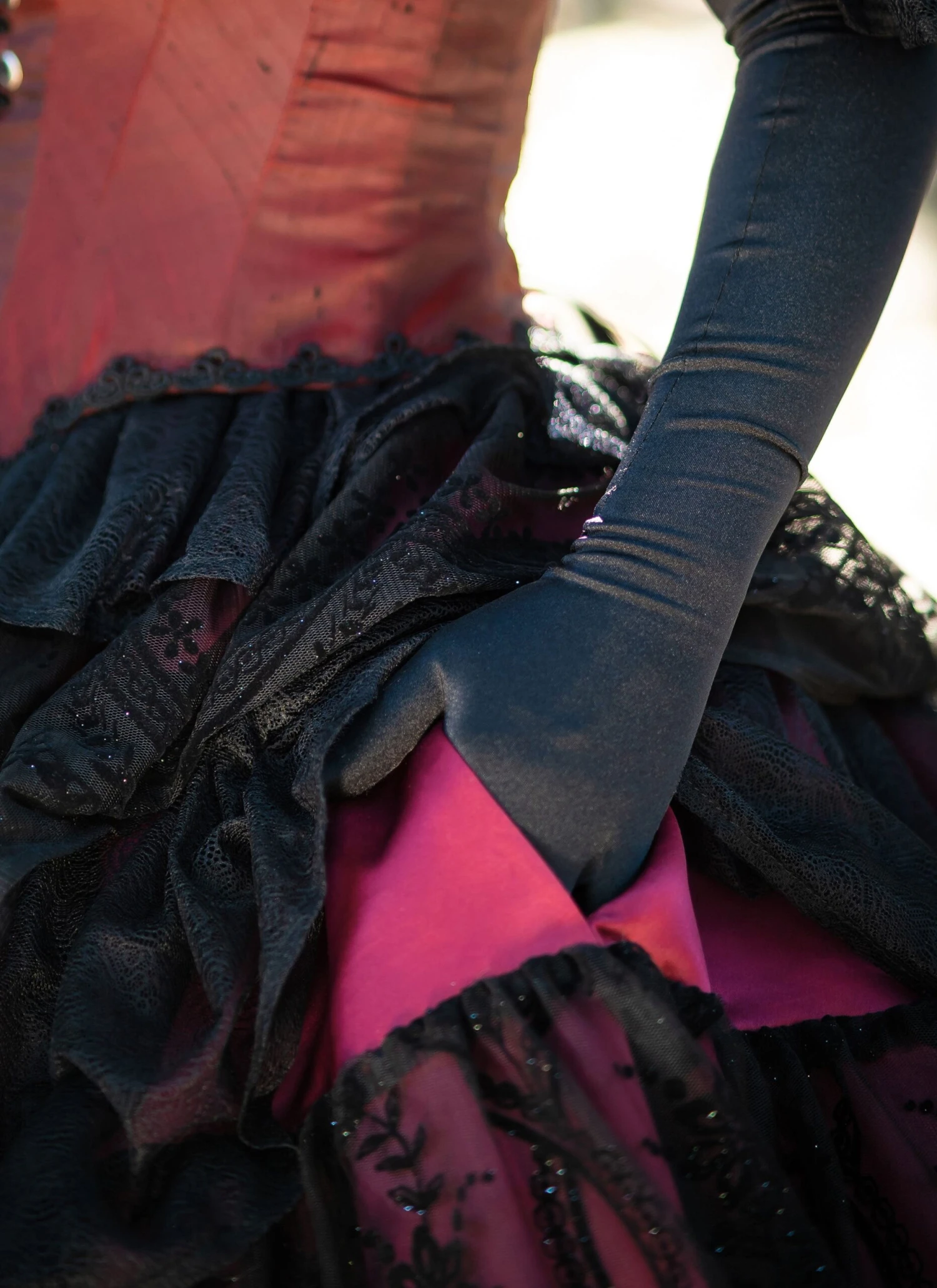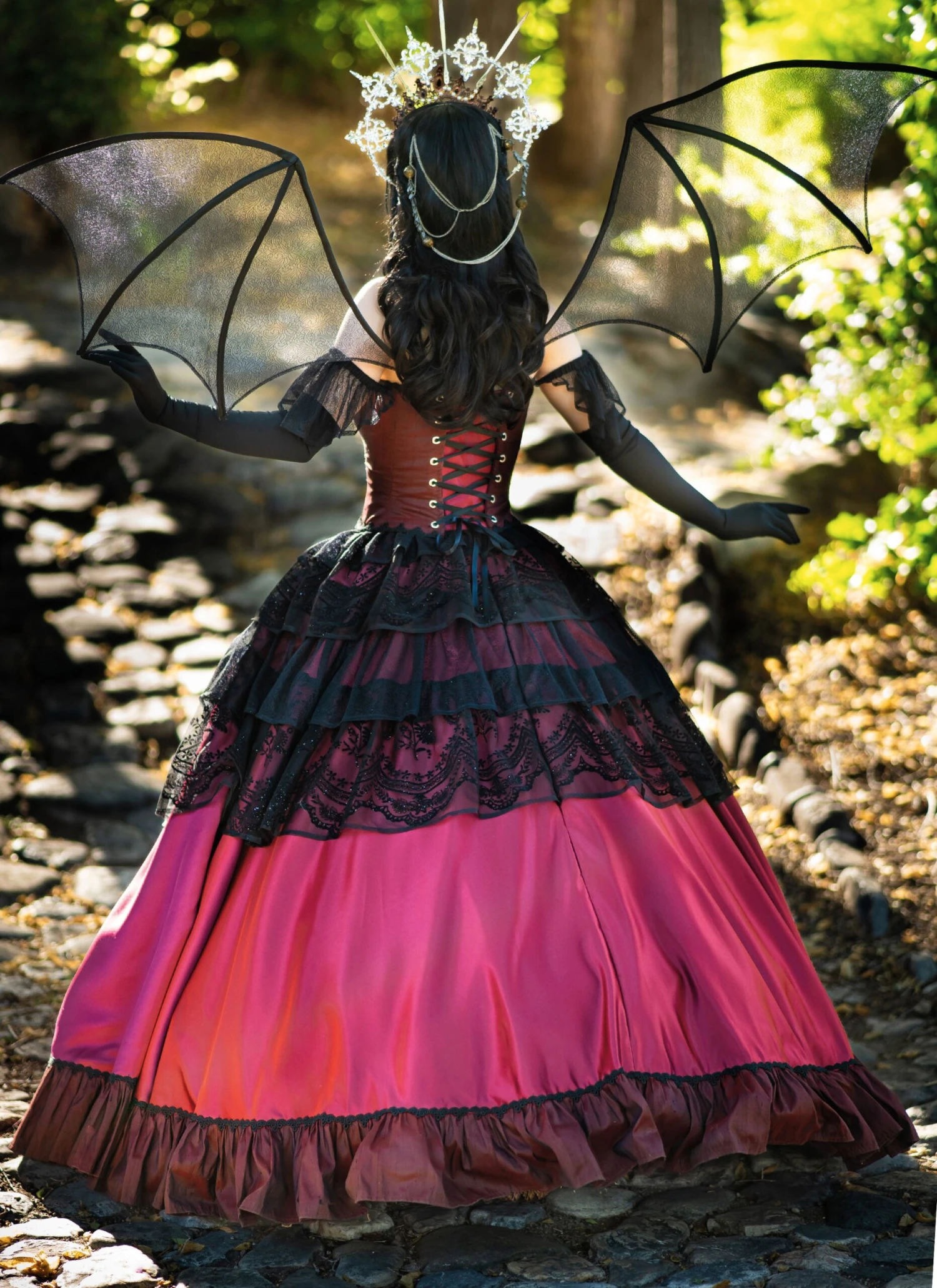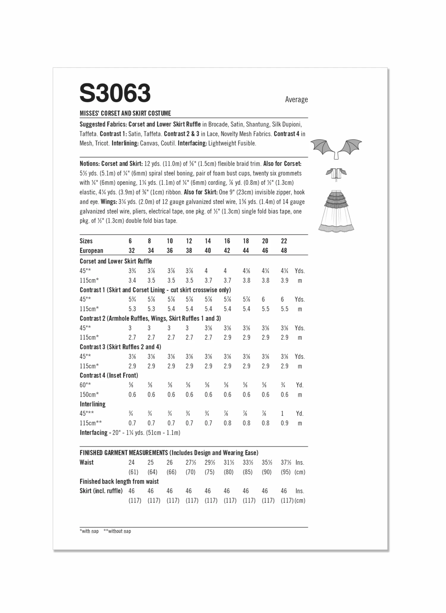 Simplicity sewing pattern for Fully lined and boned corset has back lacing, inner bust cups, front lacing with grommets and modesty inset, braid trim and contrast flounced sleeves worn off the shoulder. Floor length gathered skirt has back zipper, contrast hem ruffle and shaped ruffles of alternating fabrics gathered to waistband. Gothic wings created using wire, bias tape ribs and sheer fabric slide easily into back of corset for easy and secure wearing. Petticoat and accessories not included. See envelope for more information.