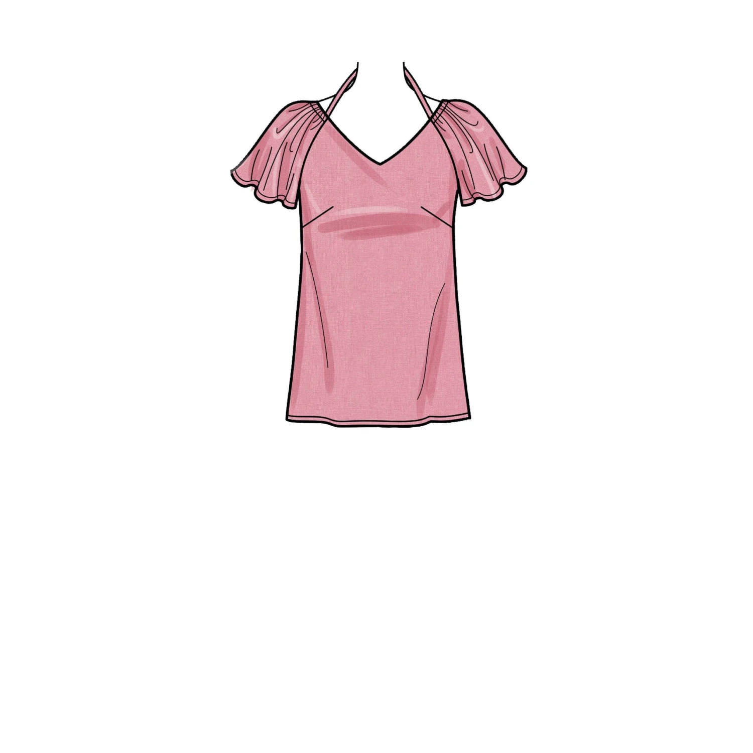 Simplicity Sewing pattern for Misses’ and women’s pullover v-neck tops in two lengths with gathered three-quarter, elbow and short flutter sleeves.