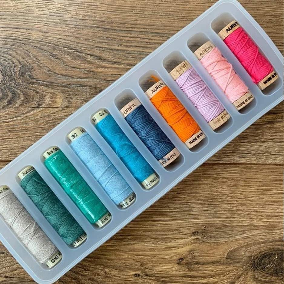 The flexibility of the silicone means it can store threads from several different brands including Gutermann, Aurifil and Coats even though each brand’s spool is different in size. The size of each slot is 1.8cm x 7.7cm and stretch a little.