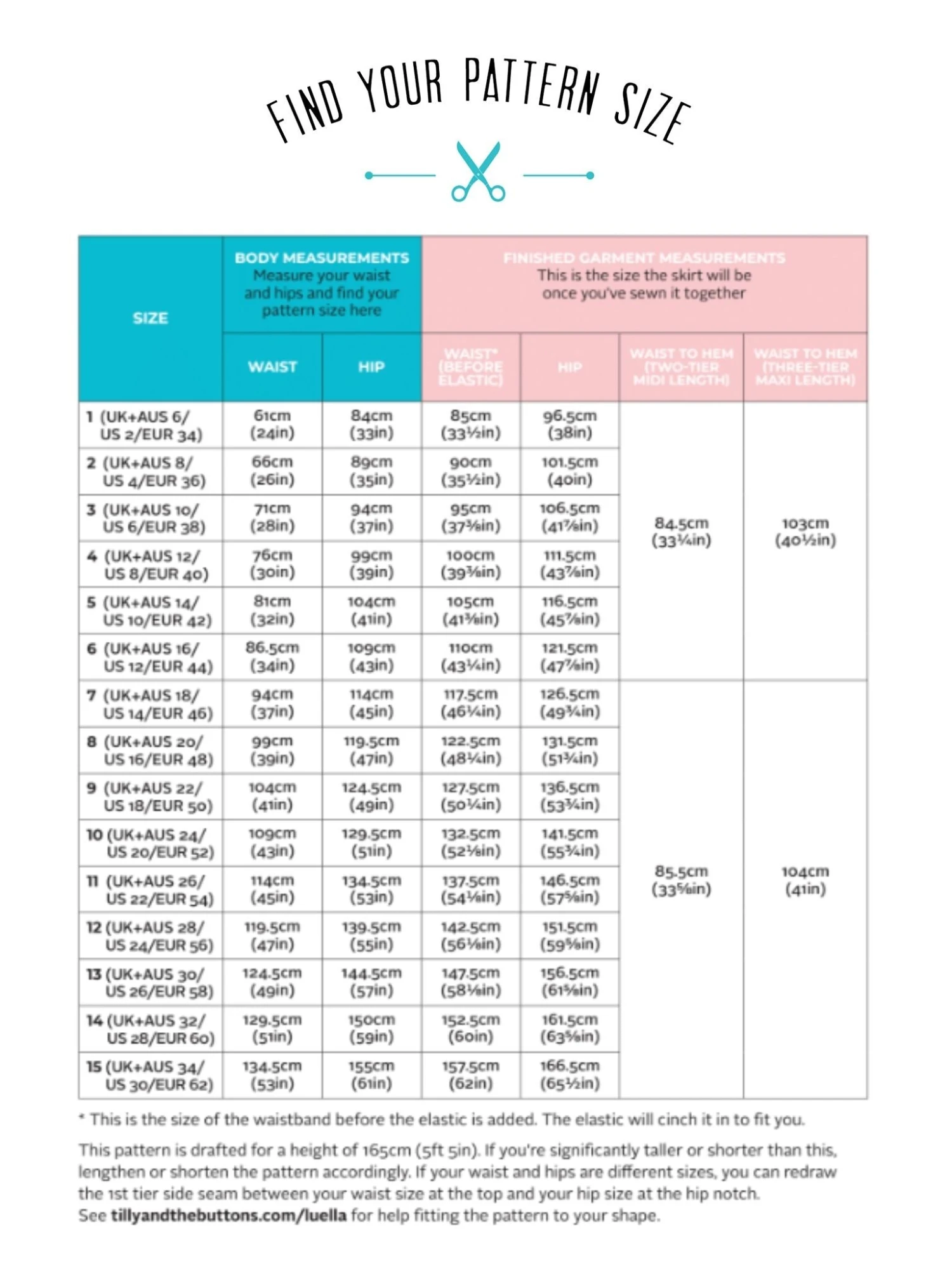 PATTERN SIZE BUST WAIST HIP UK 6 76cm (30in) 61cm (24in) 84cm (33in) UK 8 81cm (32in) 66cm (26in) 89cm (35in) UK 10 86.5cm (34in) 71cm (28in) 94cm (37in) UK 12 91.5cm (36in) 76cm (30in) 99cm (39in) UK 14 96.5cm (38in) 81cm (32in) 104cm (41in) UK 16 101.5cm (40in) 86.5cm (34in) 109cm (43in) UK 18 106.5cm (42in) 91.5cm (36in) 114cm (45in) UK 20 112cm (44in) 96.5cm (38in) 119.5cm (47in) UK 22 117cm (46in) 101.5cm (40in) 124.5cm (49in) UK 24 122cm (48in) 106.5cm (42in) 129.5cm (51in) UK 26 132cm (52in) 114cm (45in) 134.5cm (53in) UK 28 137cm (54in) 119.5cm (47in) 139.5cm (55in) UK 30 142cm (56in) 124.5cm (57in) 144.5cm (57in) UK 32 147cm (58in) 129.5cm (51in) 150cm (59in) UK 34 152.5cm (60in) 134.5cm (53in) 155cm (61in)