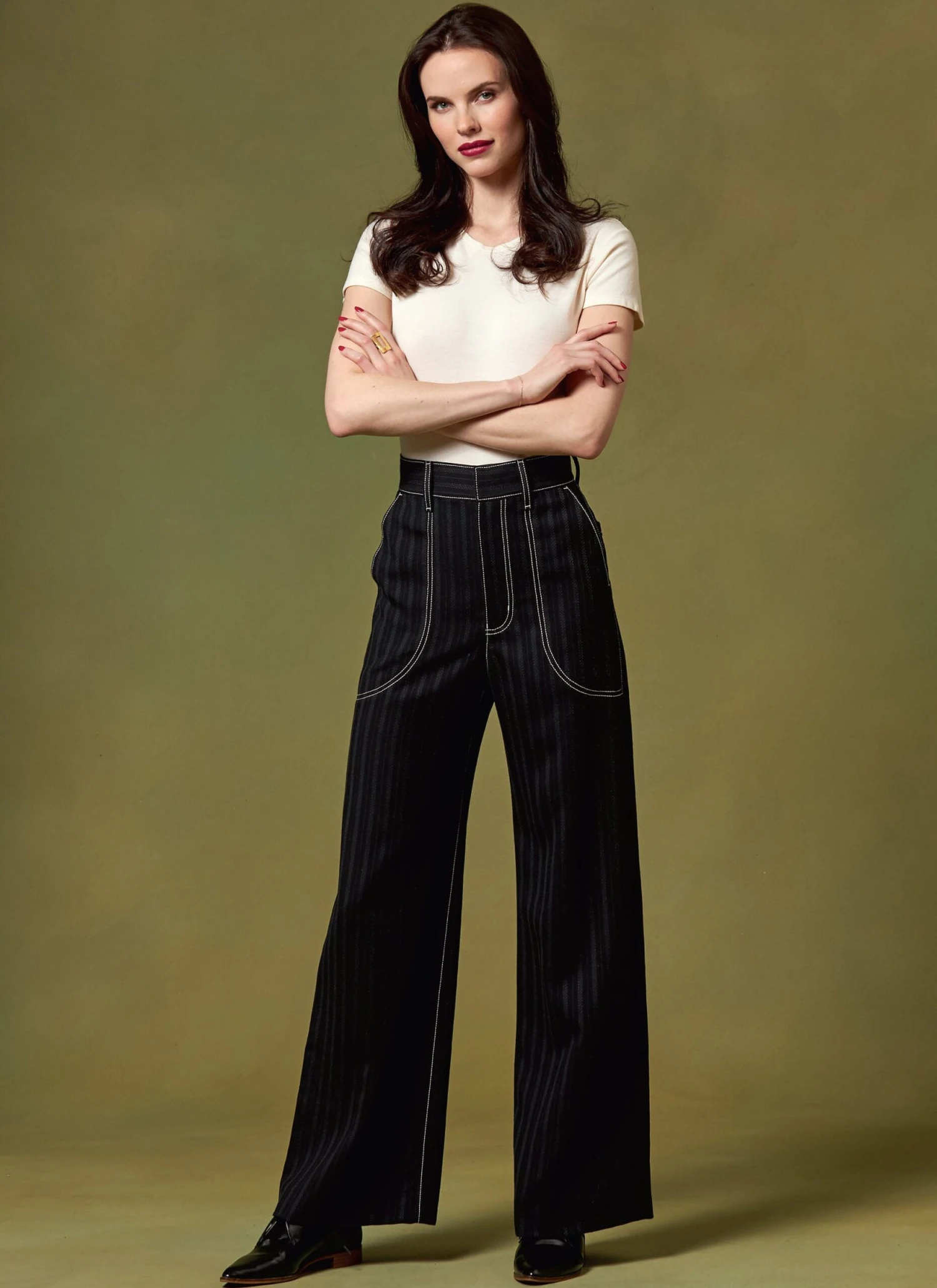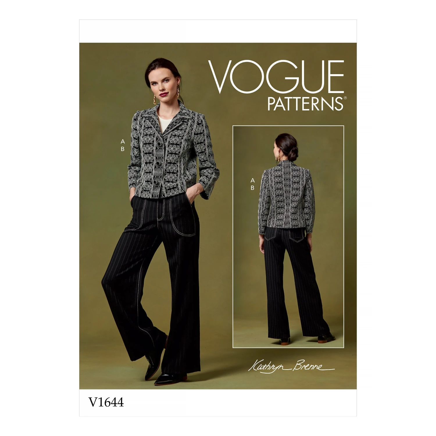 Designed by Kathryn Brenne, this Vogue Sewing Pattern for Women offers a fitted, unlined jacket with button trim and snap closures, along with slightly flared pants featuring a fly closure, zipper, waistband hook and bars, and convenient side and back pockets.
