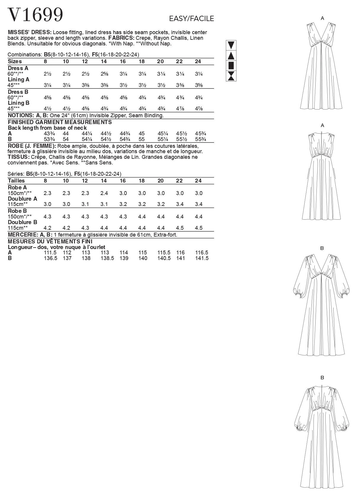 Looking for the perfect dress for your special occasions? Look no further than this Vogue Sewing Pattern for Women! With a loose-fitting, lined design and stylish sleeve and length variations, it’s the perfect addition to your wardrobe. Plus, with convenient side seam pockets and an invisible center back zipper, it’s both functional and fashionable.