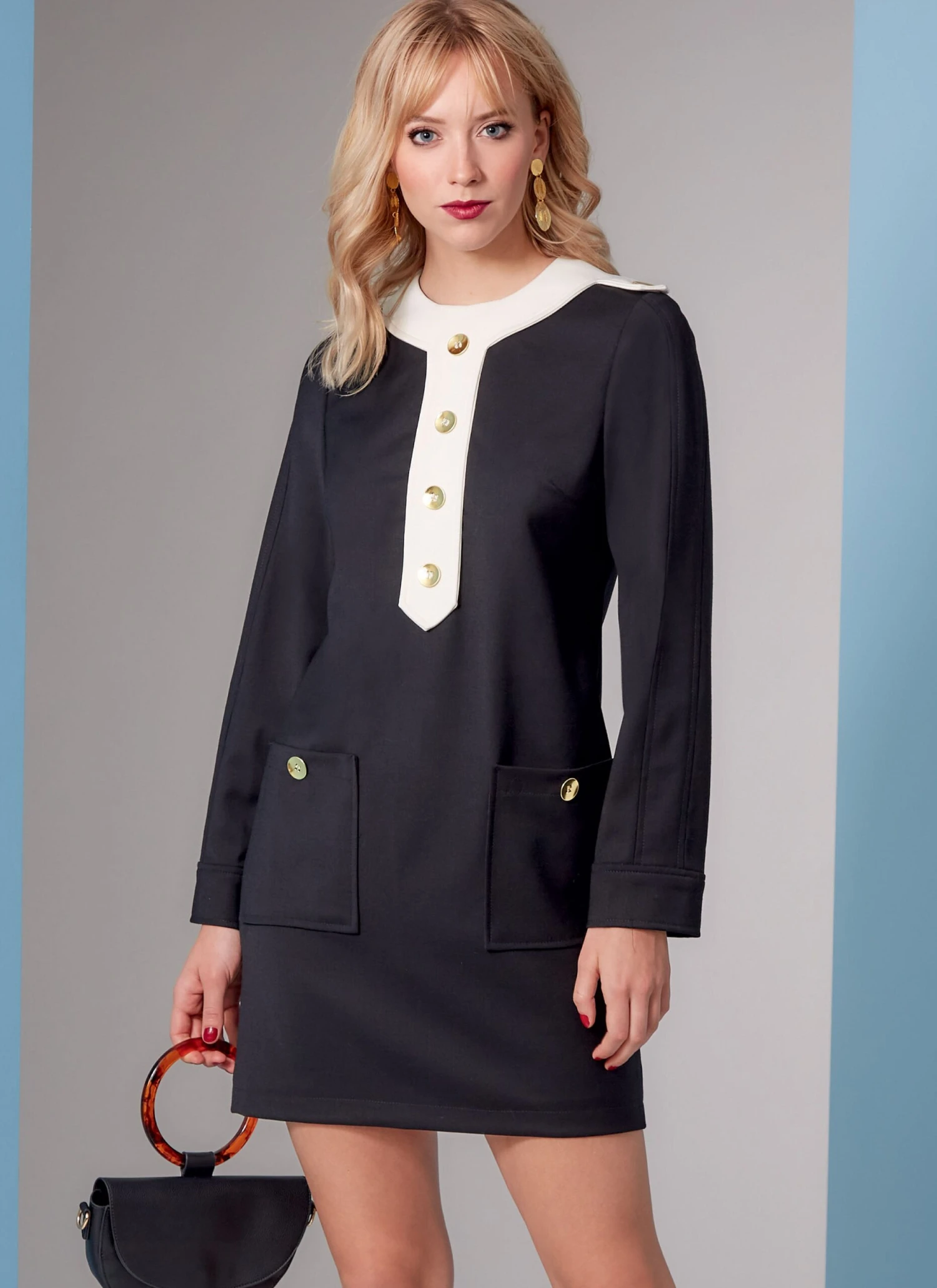 Experience effortless style with this Vogue Sewing Pattern for Women. This petite long-sleeved shift dress is lined and fitted, featuring epaulettes and center front banding with button trim. The three-piece set-in sleeves with cuff detail and patch pockets add unique touches, while the invisible back zipper provides a seamless finish. Plus, separate pattern pieces are included for cup sizes A, B, C, D for a perfect fit.