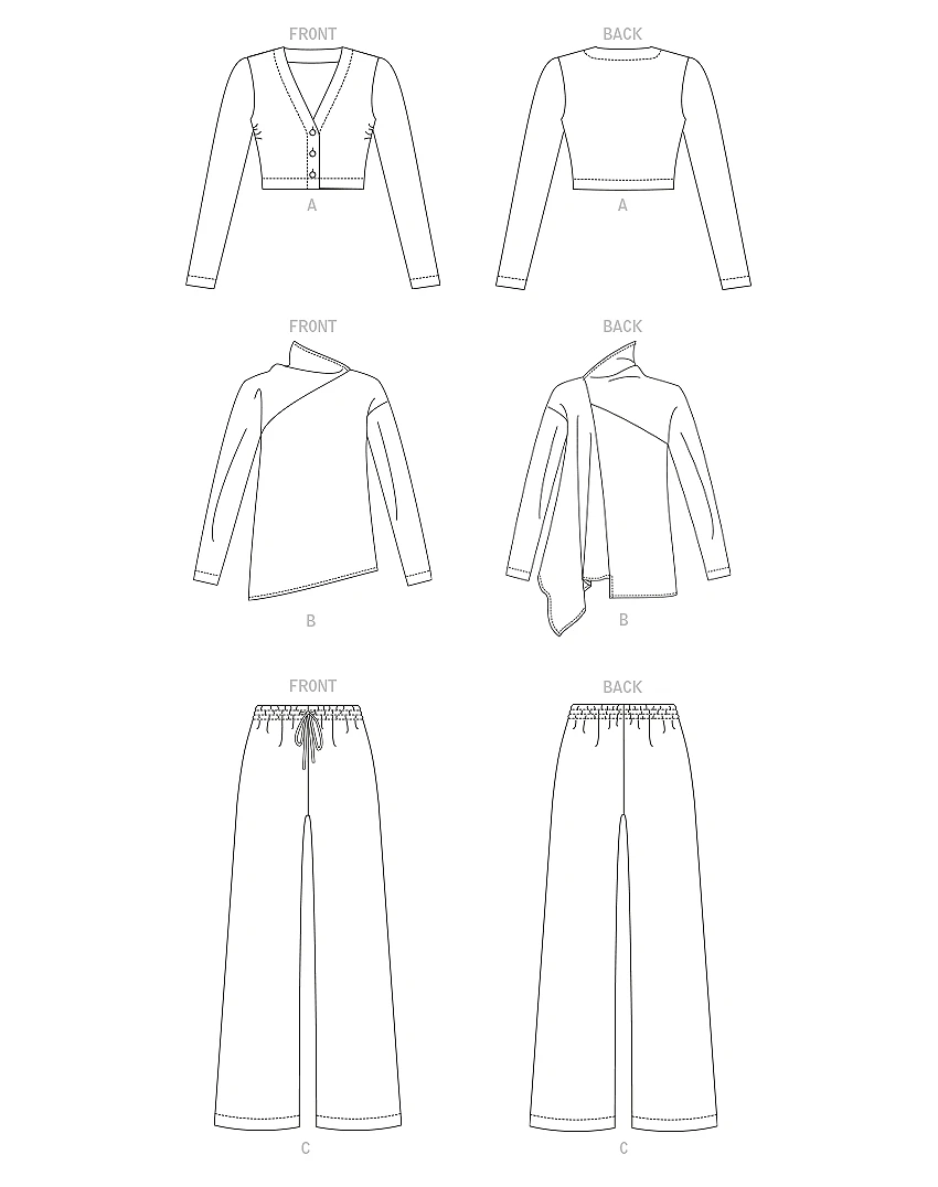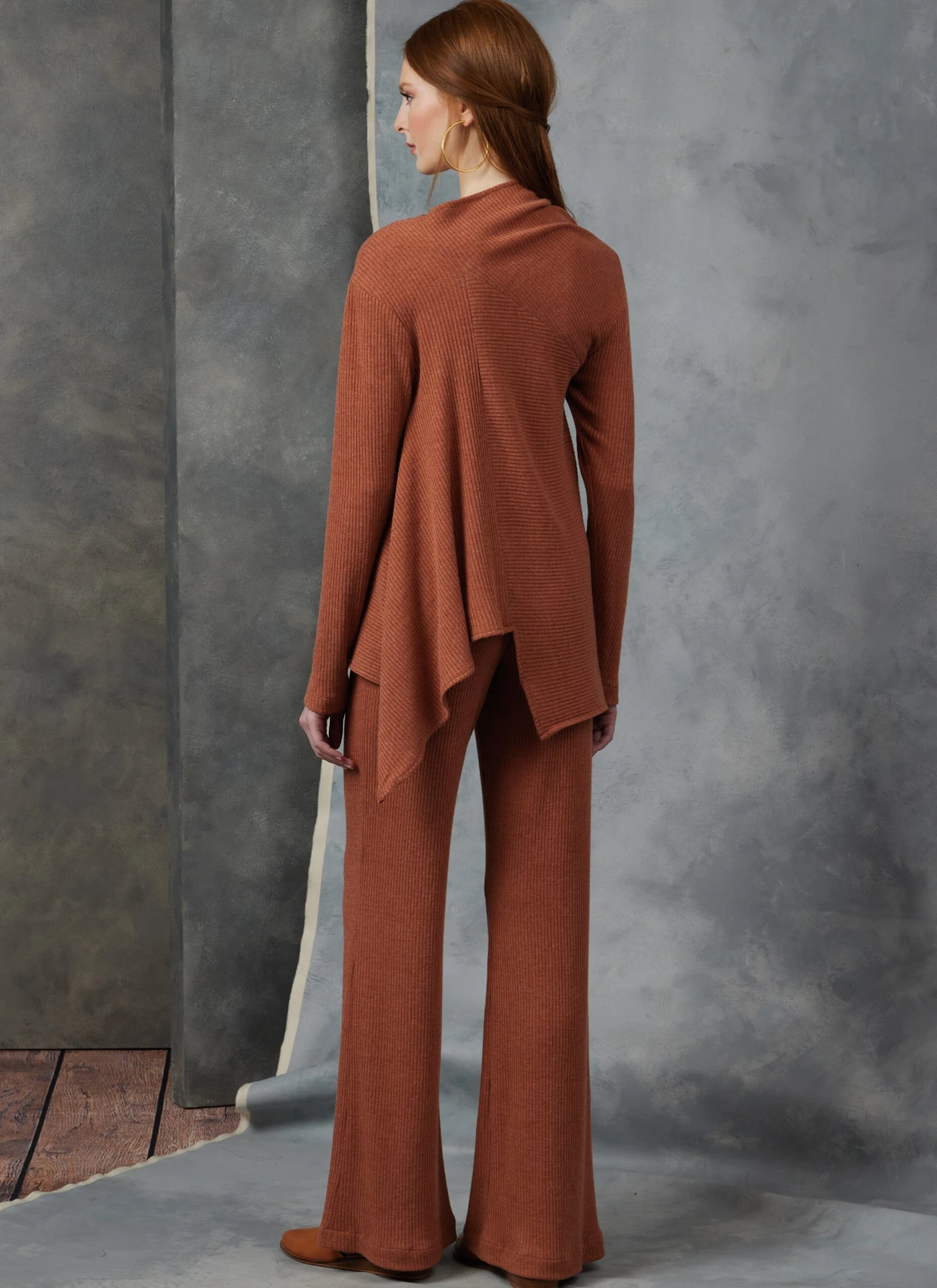 This Vogue Sewing Pattern for Women offers a slim-fit V-neck cardigan with a button front and neckline facings. The loose-fitting asymmetrical tunic has long sleeves, an uneven hemline, and stitched hems. The wide-leg pull-on pants come with an elastic waist, drawstring, and stitched hems for added comfort. Easy to Sew and perfect for beginners.