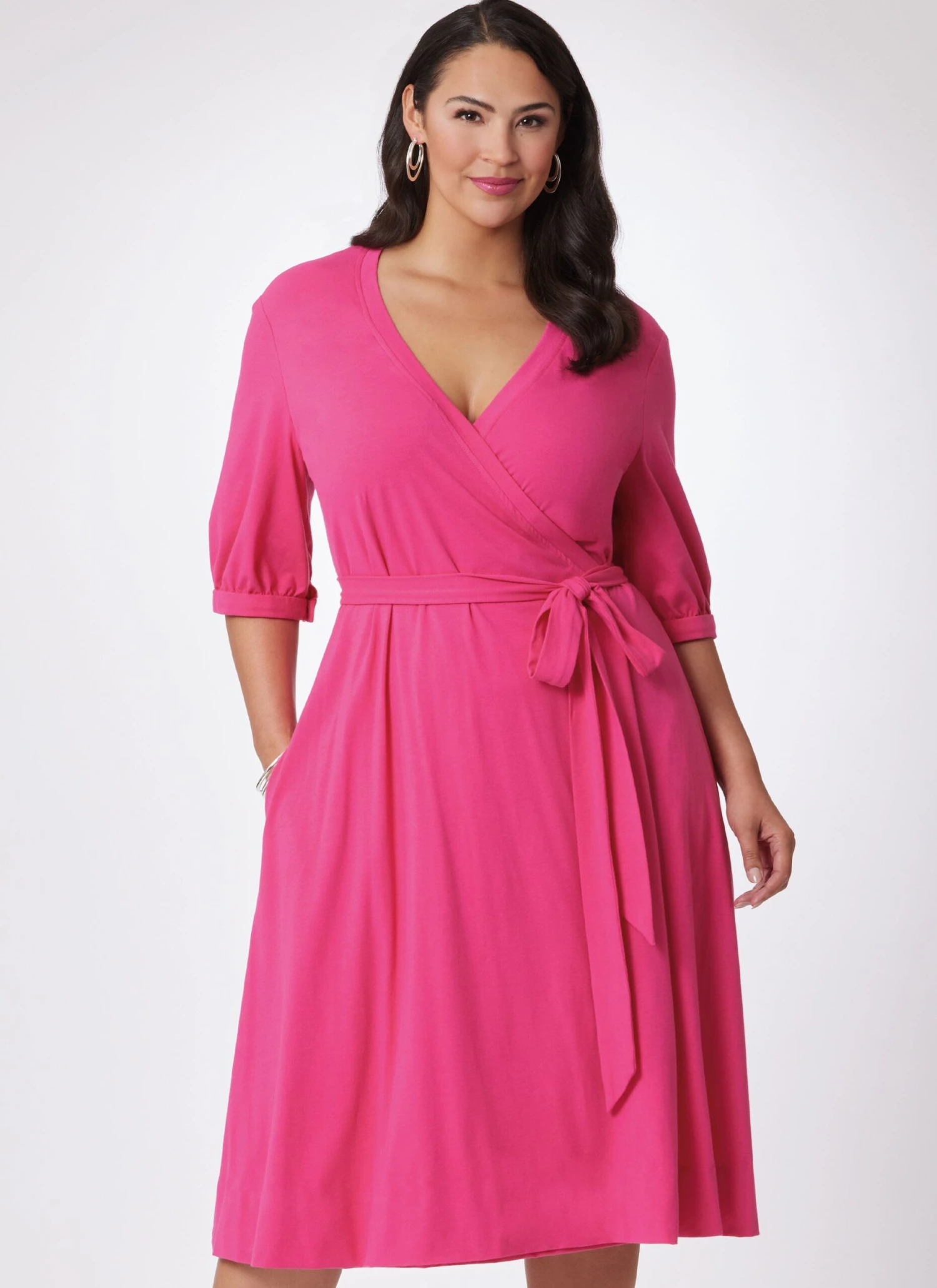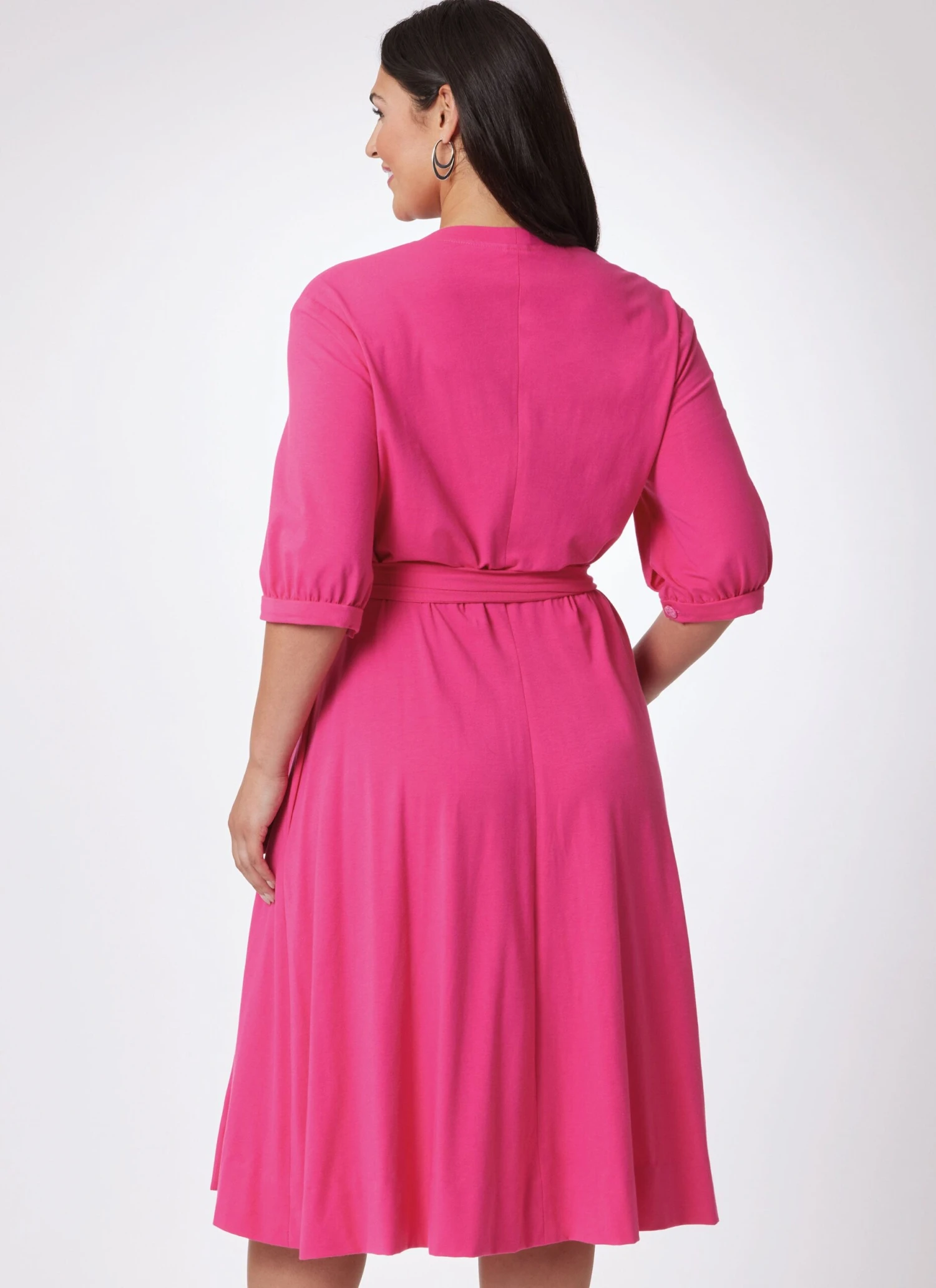 Sewing Pattern for Vintage Vogue 1970’s Dress by Diane von Furstenberg. For Stretchable Knits Only. Front wrap dress, three inches below mid-knee, has fitted bodice, V-neckline, neckline bands, pockets in side seams, attached tie ends holding in fullness at waistline and above elbow length sleeves gathered into buttoned bands or full-length sleeves gathered into buttoned cuffs. Topstitch trim. Authentic Vintage Reproduction pattern includes additional size options and cutting layouts.