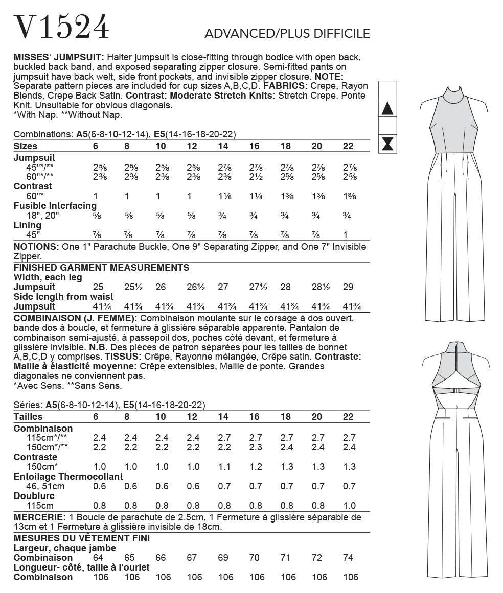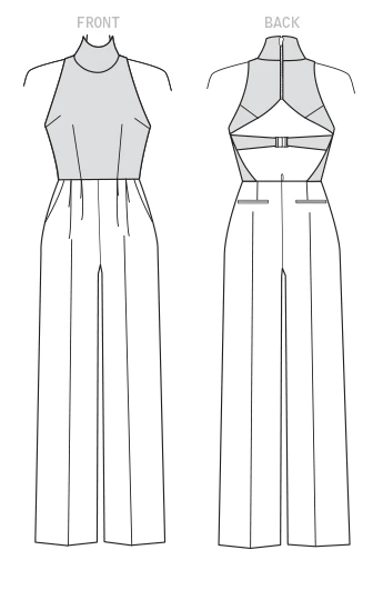 Halter jumpsuit is close-fitting through bodice with open back, buckled back band, and exposed separating zipper closure. Semi-fitted pants on jumpsuit have back welt and side-front pockets and invisible zipper closure. Note: Separate pattern pieces are included for cup sizes A, B, C, D.