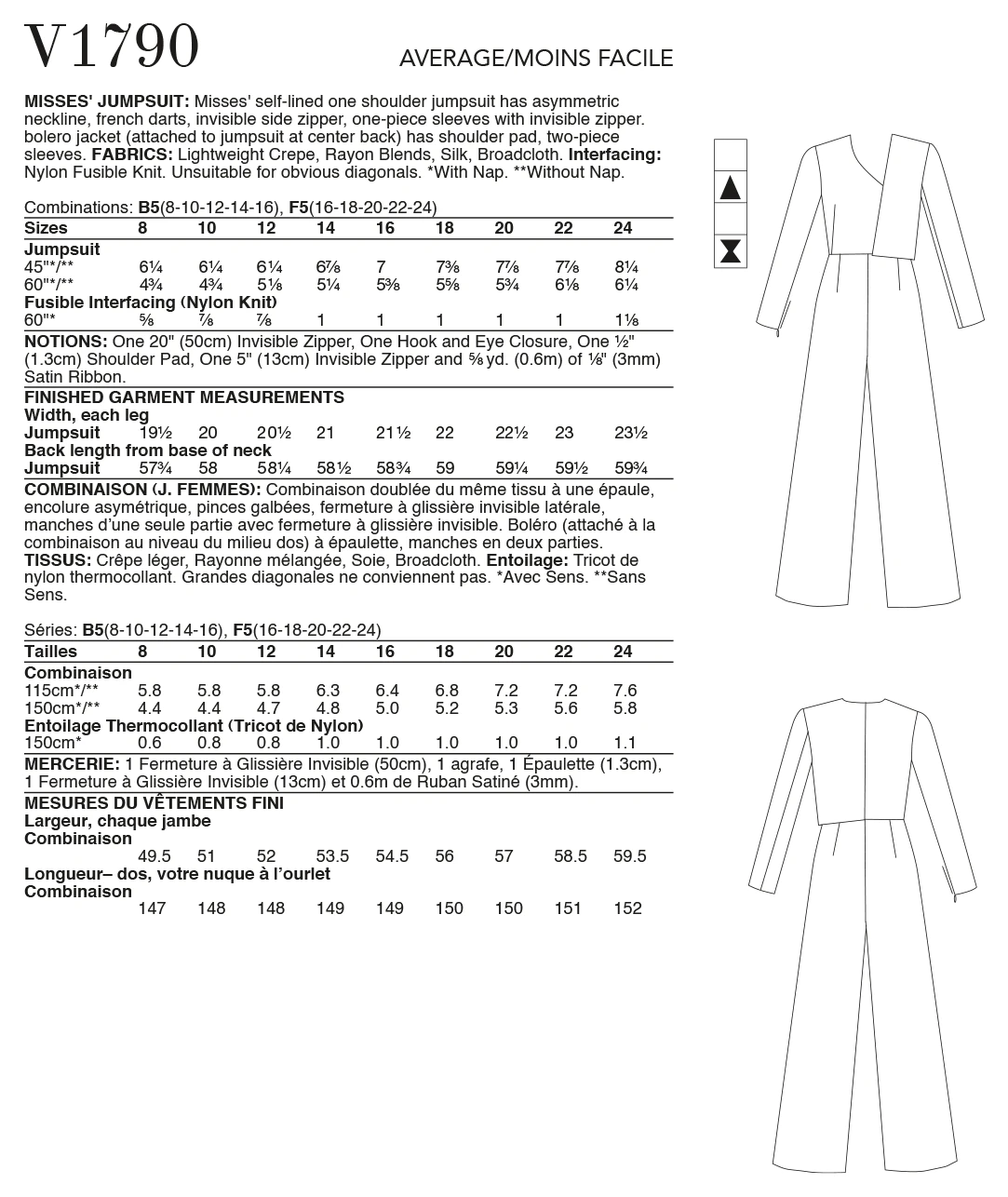 Designed by Guy Laroche, this Vogue Sewing pattern for a stunning self-lined one shoulder jumpsuit with an asymmetrical neckline, delicate French darts, an invisible side zip, and one-piece sleeves with an invisible zip. The bolero jacket, attached at the center back of the jumpsuit, is equipped with shoulder pads and two-piece sleeves for a polished finish.