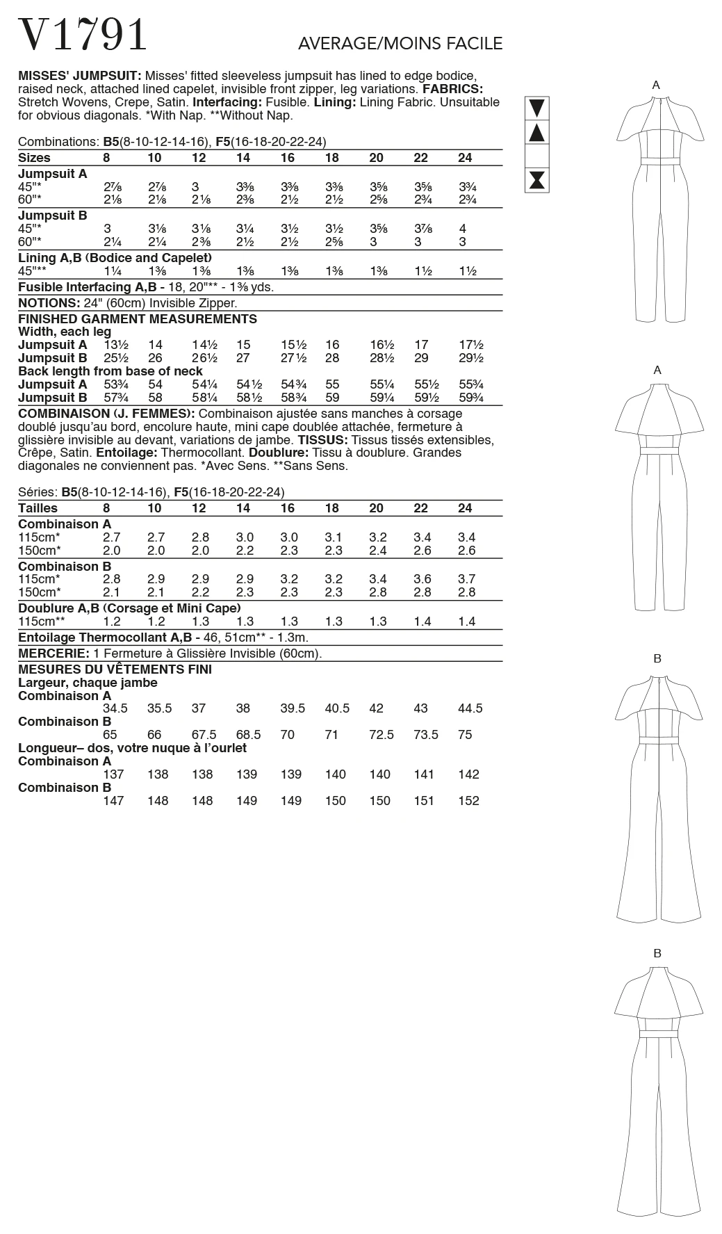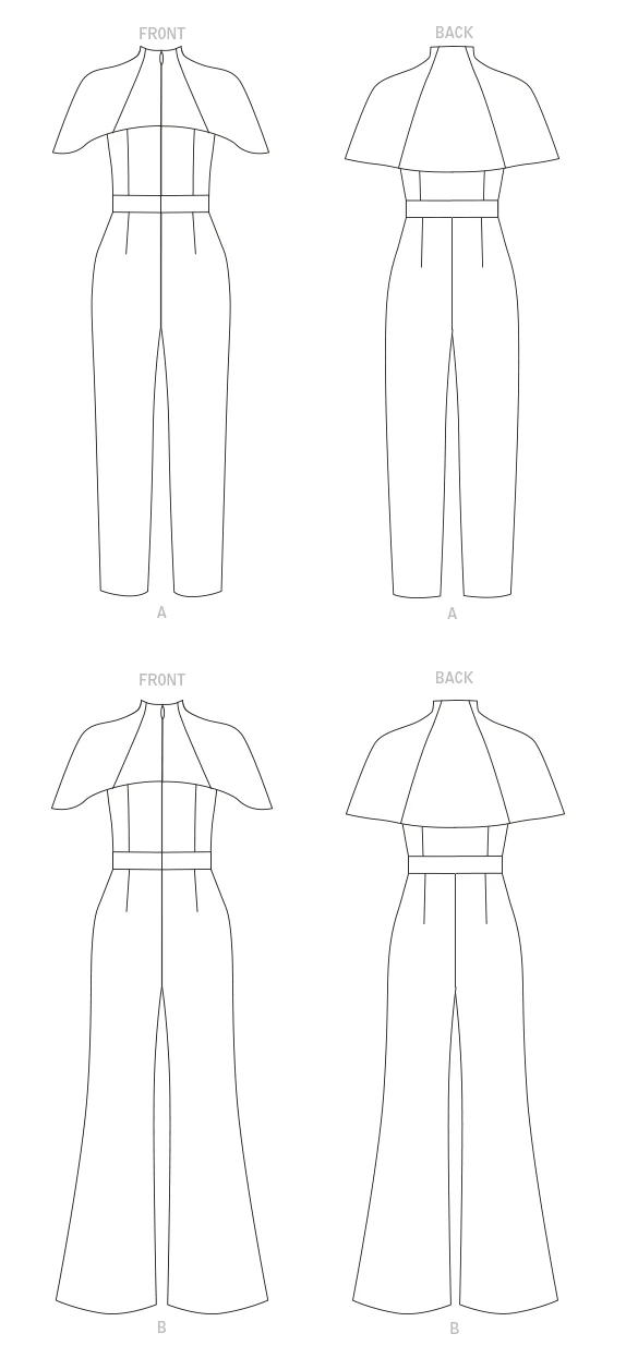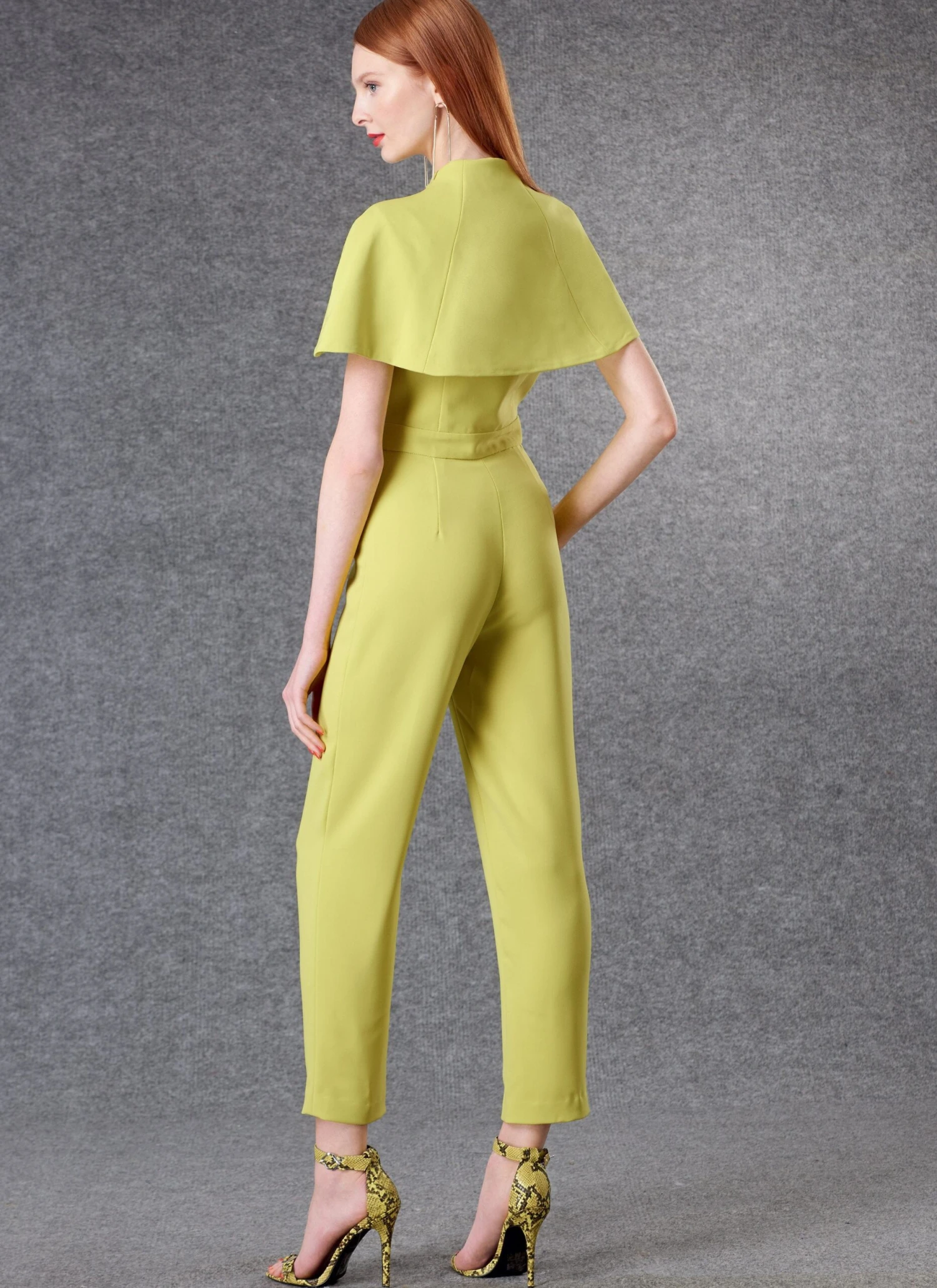 Make a striking jumpsuit with Vogue Sewing Pattern 1891. The bodice is lined to the edge, with a raised neck and an attached capelet for added flair. It also features an invisible front zipper and various leg options for versatility.