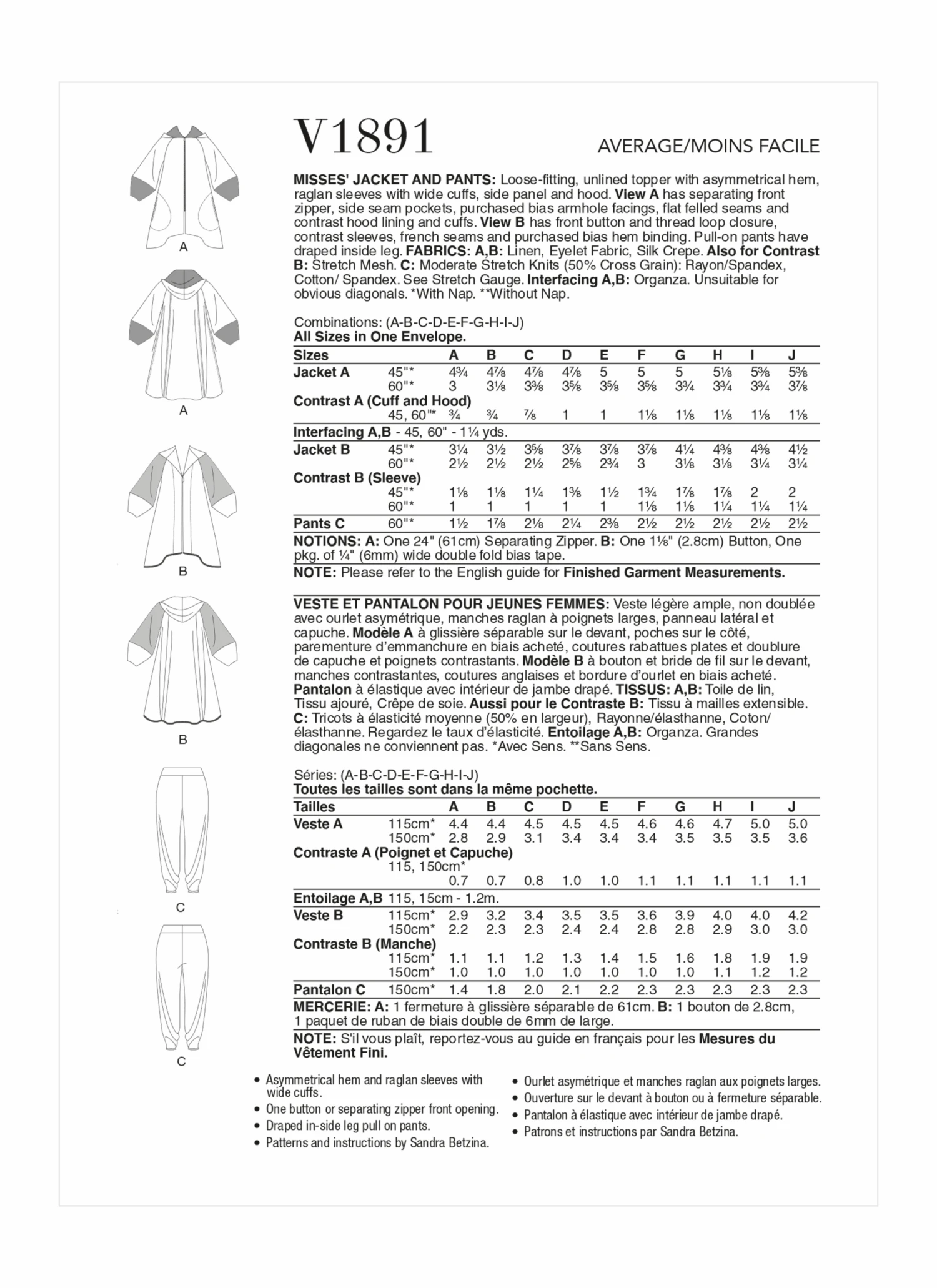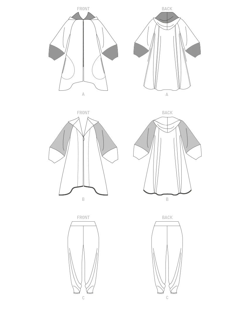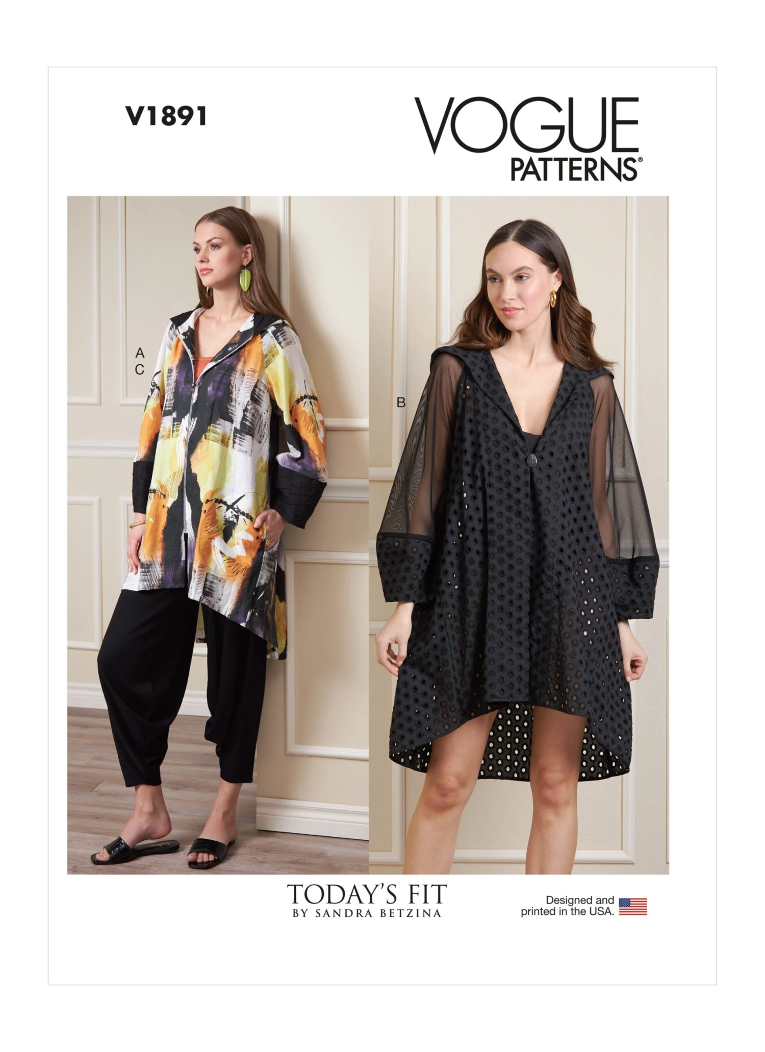 Today’s Fit By Sandra Betzina, Vogue pattern for Loose-fitting, unlined topper with asymmetrical hem, raglan sleeves with wide cuffs, side panel and hood. View A has separating front zipper, side seam pockets, purchased bias armhole facings, flat felled seams and contrast hood lining and cuffs. View B has front button and thread loop closure, contrast sleeves, French seams and purchased bias hem binding. Pull-on pants have draped inside leg.