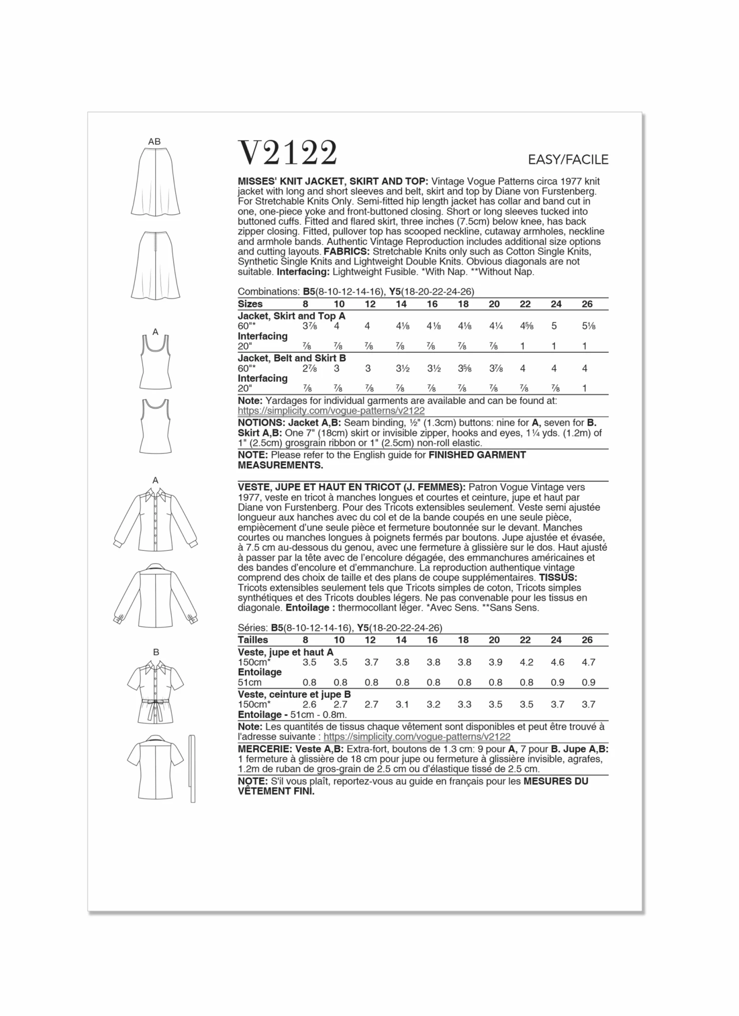 Vogue pattern for Vintage Vogue Patterns circa 1977 knit jacket with long and short sleeves and belt, skirt and top by Diane von Furstenberg. For Stretchable Knits Only. Semi-fitted hip length jacket has collar and band cut in one, one-piece yoke and front-buttoned closing. Short or long sleeves tucked into buttoned cuffs. Fitted and flared skirt, three inches (7.5cm) below knee, has back zipper closing. Fitted, pullover top has scooped neckline, cutaway armholes, neckline and armhole bands. Authentic Vintage Reproduction includes additional size options and cutting layouts.