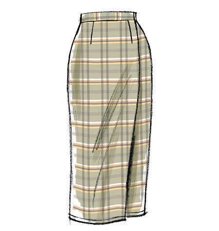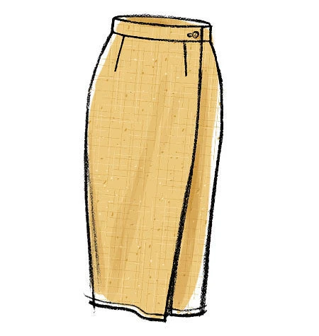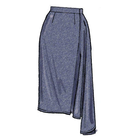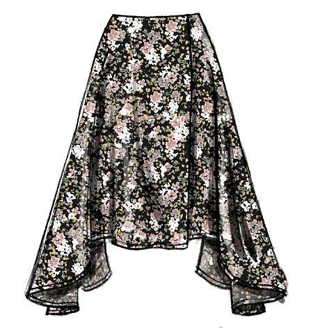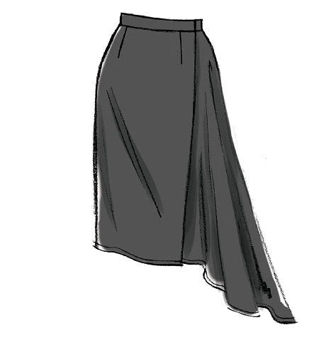 | MISSES’ SKIRT: Semi-fitted, wrap skirt has button and/or hook & eye closing, and narrow hem. A, B, C and D: waistband. F: tie ends. A, B, E and F: sides extend into drape, wrong side may show. | ||||||||||