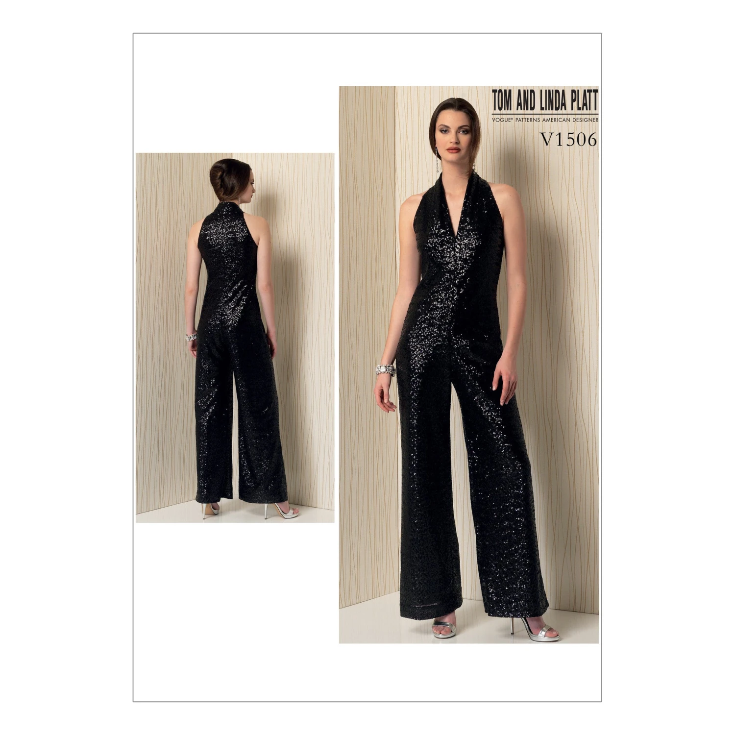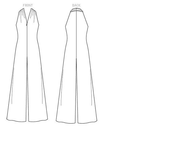 Semi-fitted, lined, wide-leg, sleeveless jumpsuit (close-fitting through bust) has front extending into back collar (cut on crosswise grain), and invisible front zipper closing.