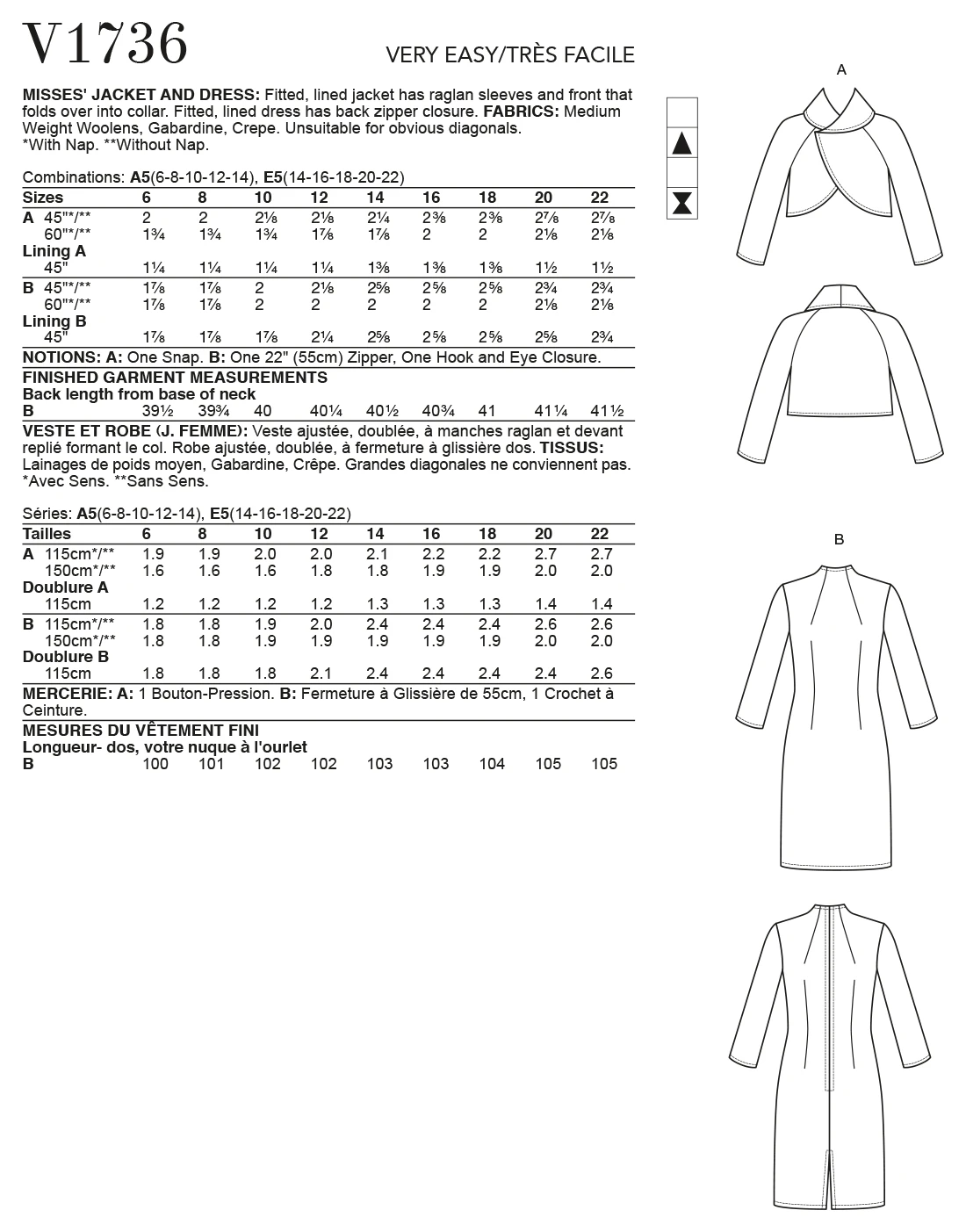 Fitted lined jacket has raglan sleeves and front that folds over into collar. Fitted lined dress has back zipper closure.