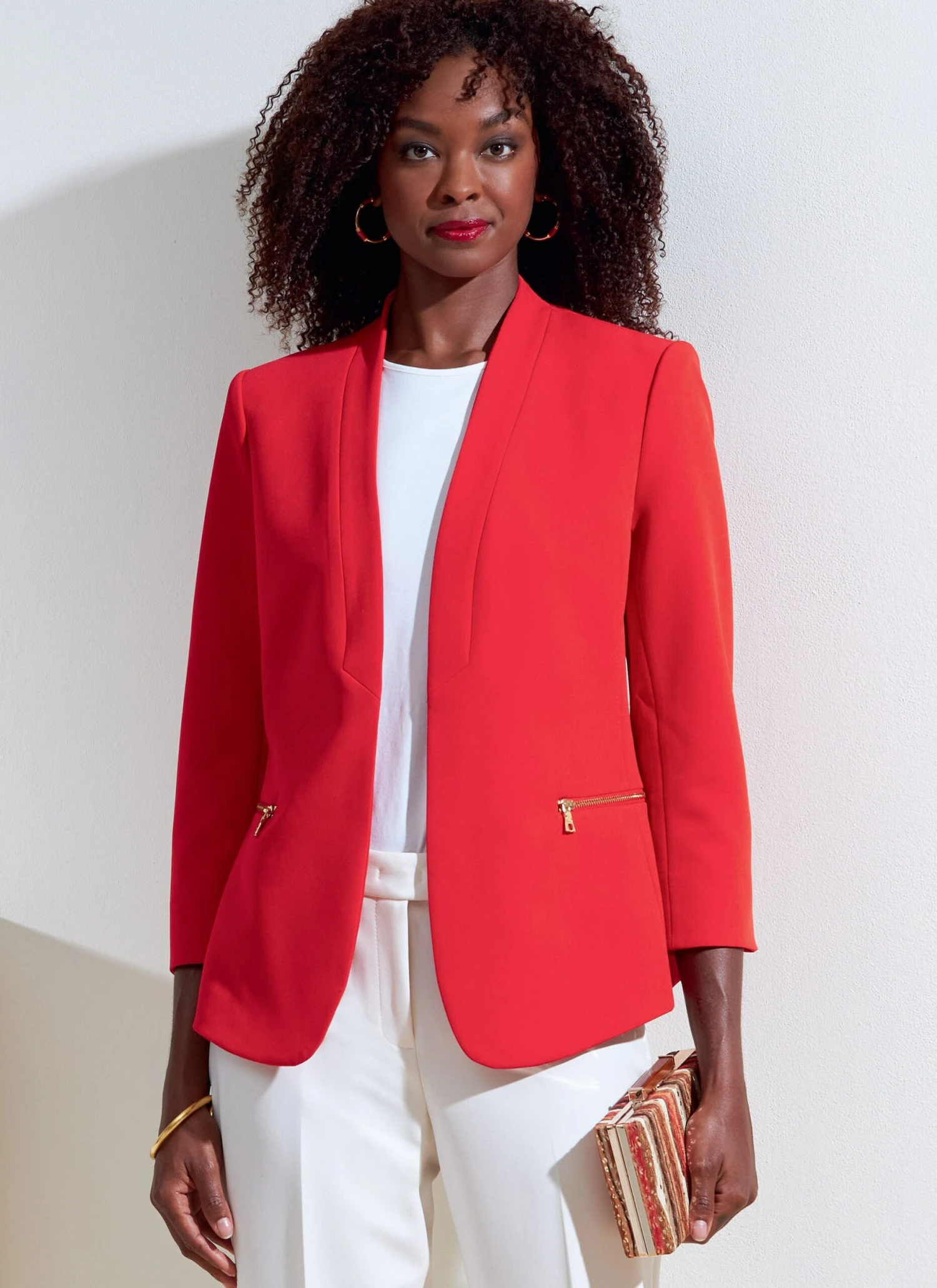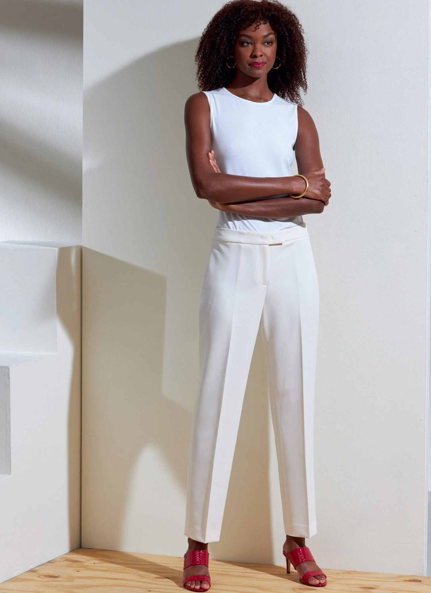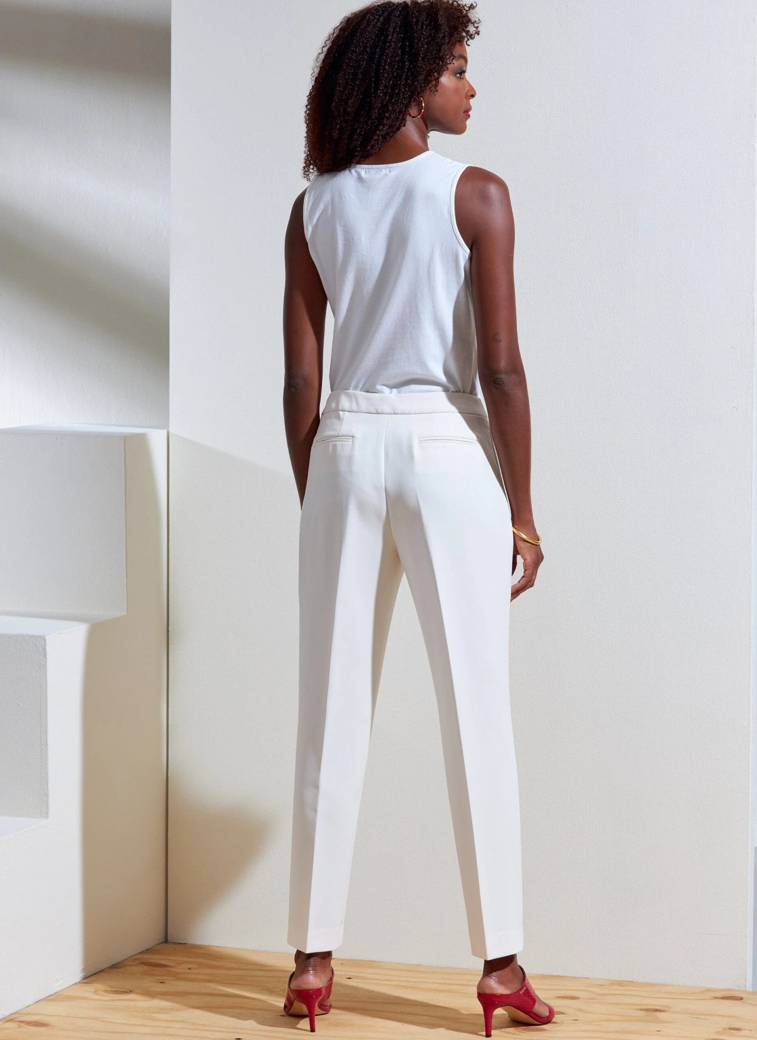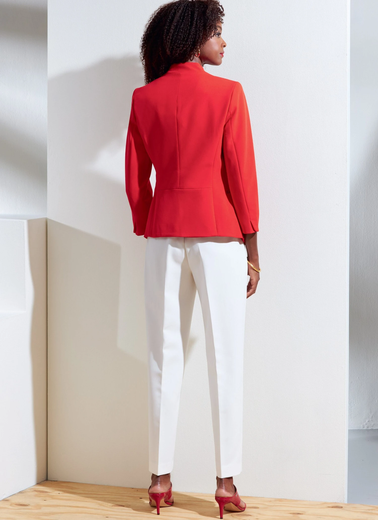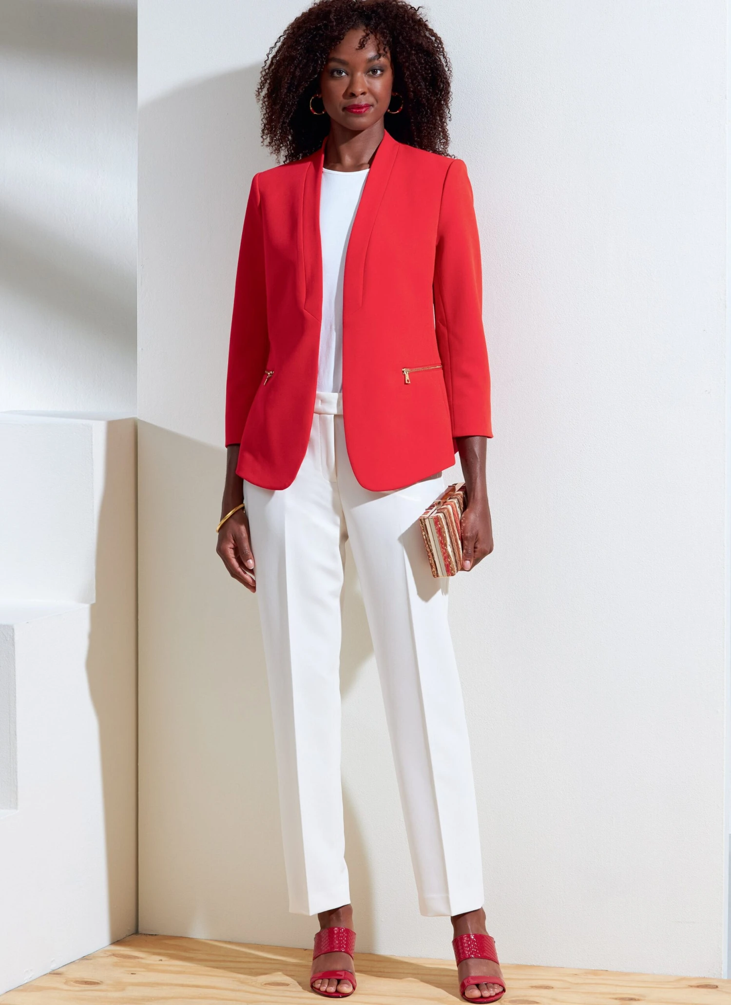 Design by Anne Klein Sewing Pattern for Semi-fitted, lined jacket has shoulder pads, 7/8 length two piece sleeves with shaped vent, side front and side back seams, cut away front, and zippered pockets. Semi-fitted, tapered pants have shaped waistband, back welt pockets and fly-zipper closing.