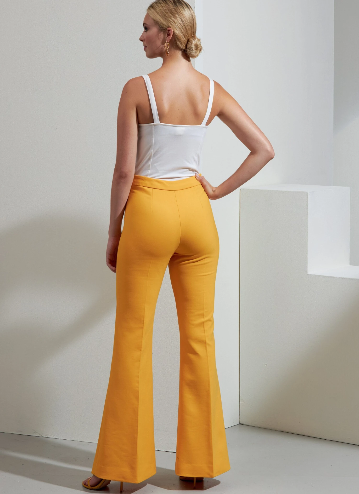 Sewing Pattern for Semi-fitted, lined, below hip length jacket has notch collar, shoulder pads, princess seams, flaps, welt pockets and long two-piece sleeves with non-working vent and button trim. Semi-fitted, high rise pants have flared legs, stitched front crease, fly zipper, contour waistband with hook and bar closure.