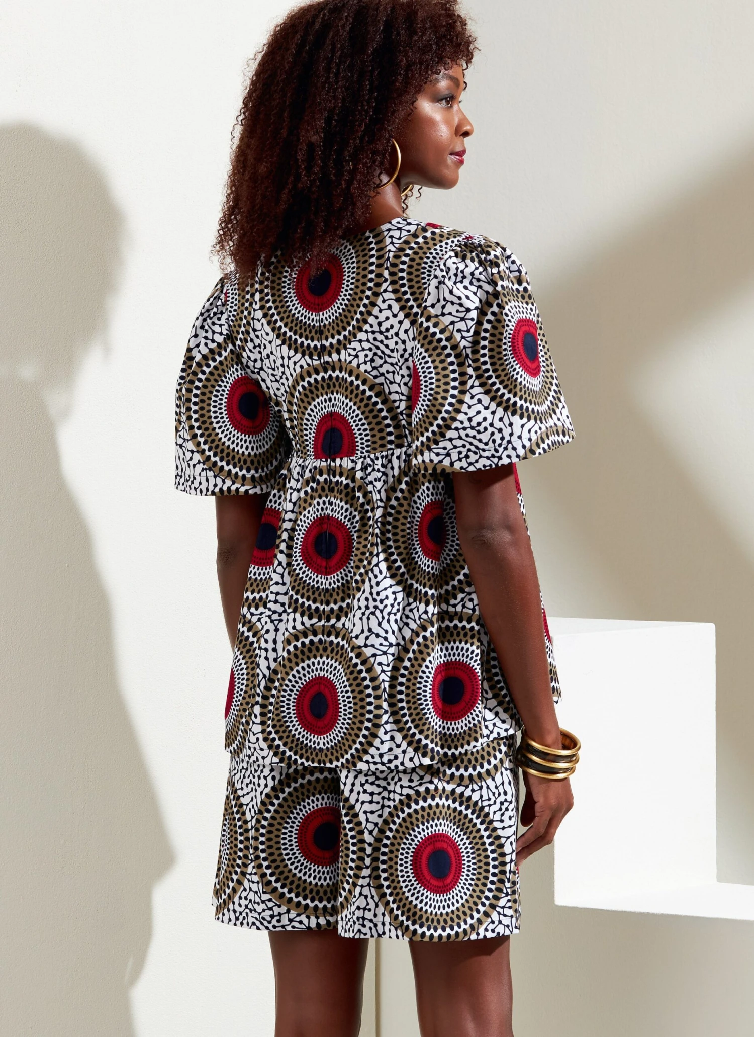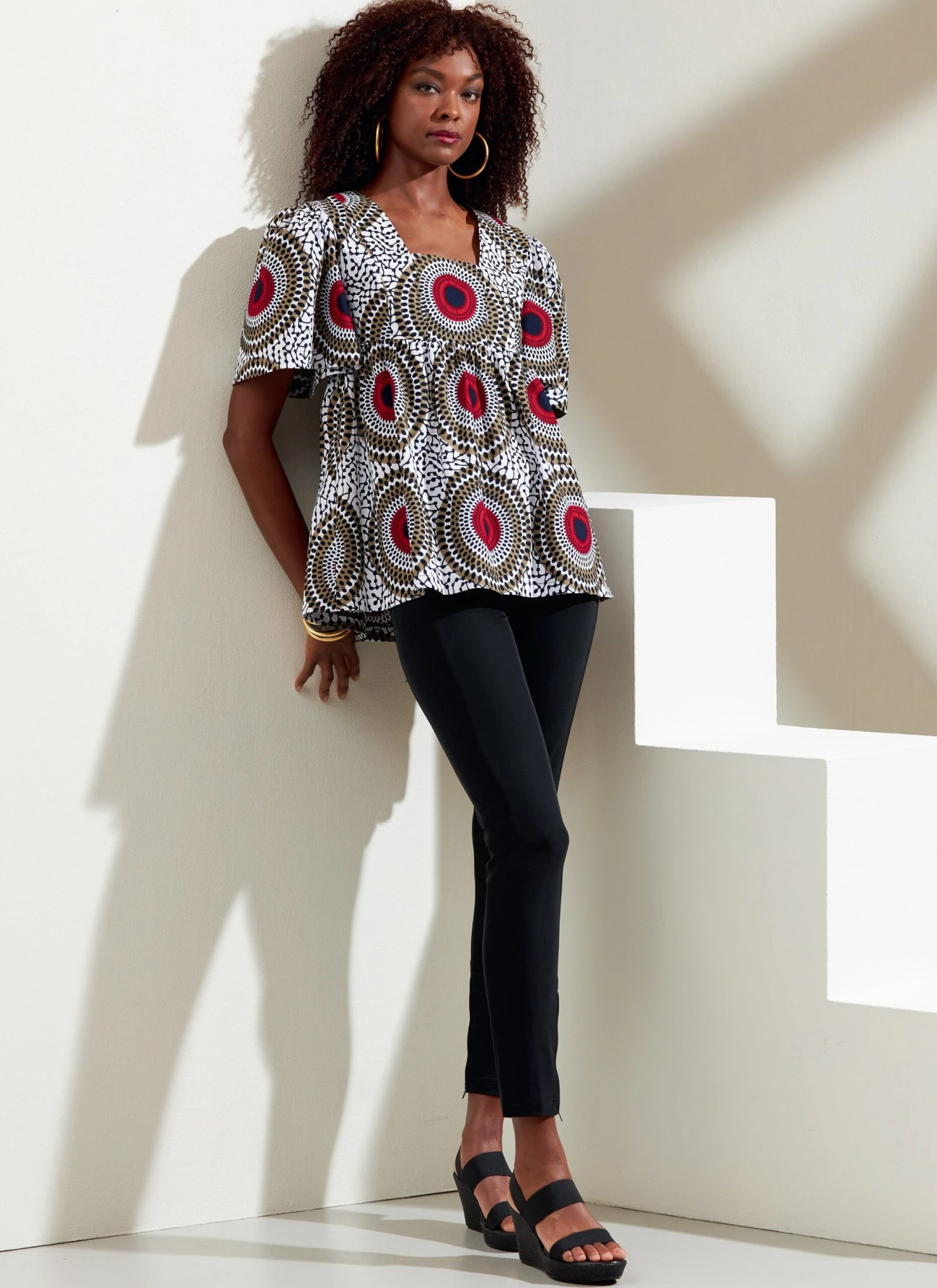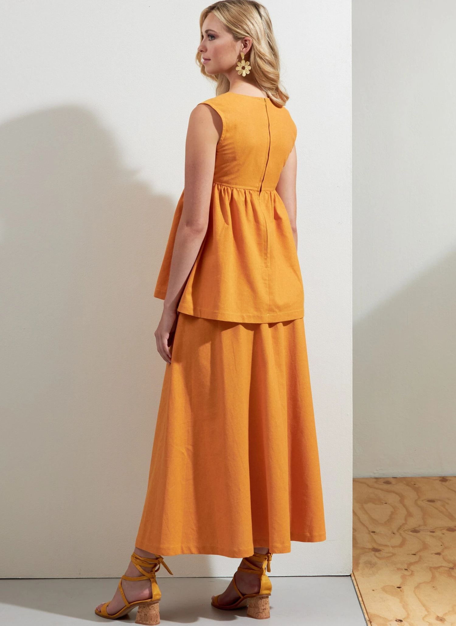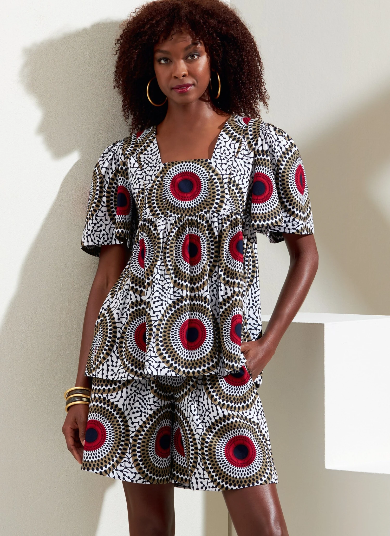Sewing Pattern for Peplum top (close-fitting through bust) has square neckline, gathered empire waist, center back zipper, stitched hems. View A has elbow length sleeves. View B has purchased bias armhole facings. Loose-fitting, high-waist shorts and skirt have elastic waist, side seam pockets and stitched hems.