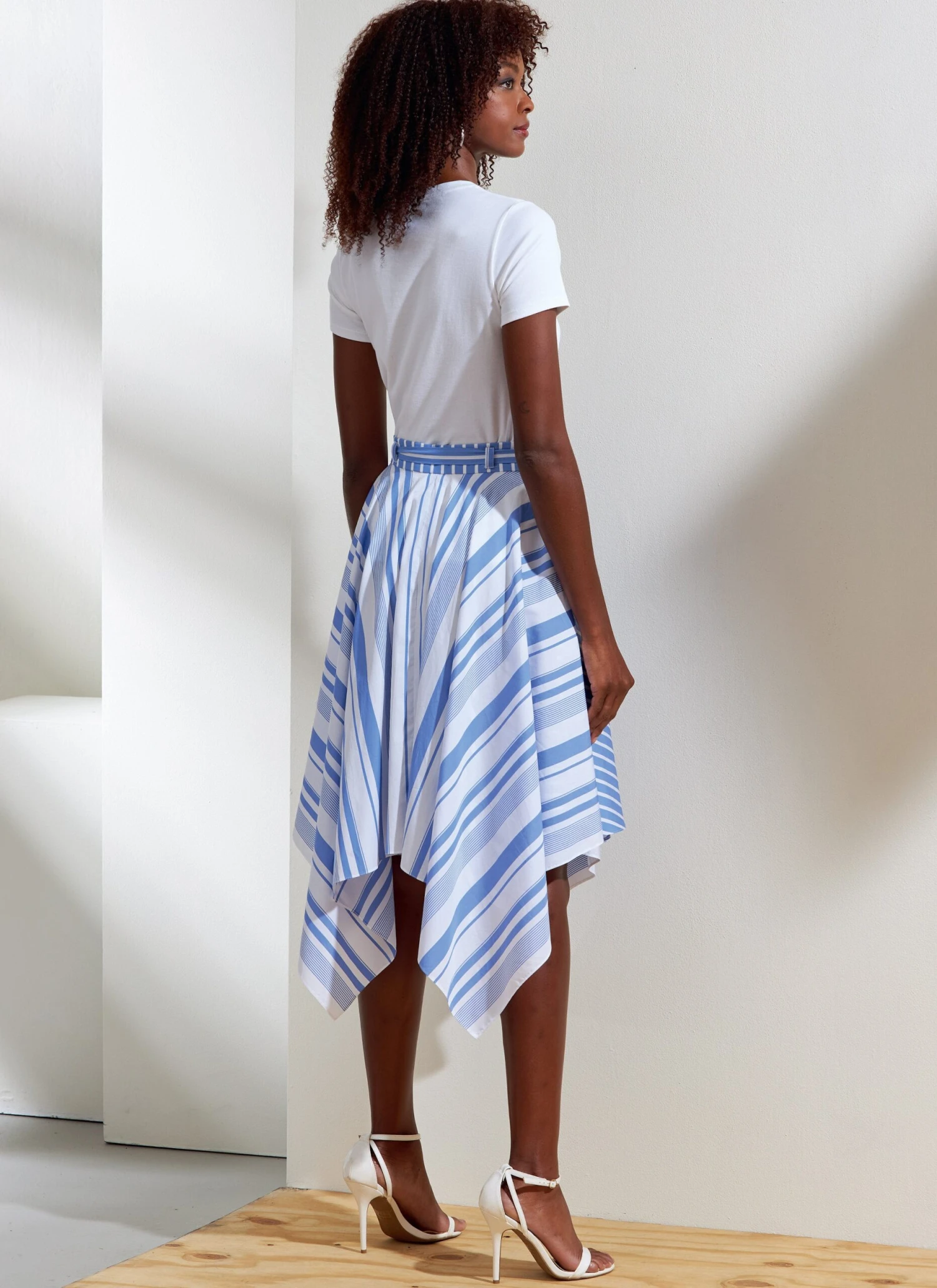 has waistband, side wrap tie, handkerchief hemline and baby hems. View A has contrast.
