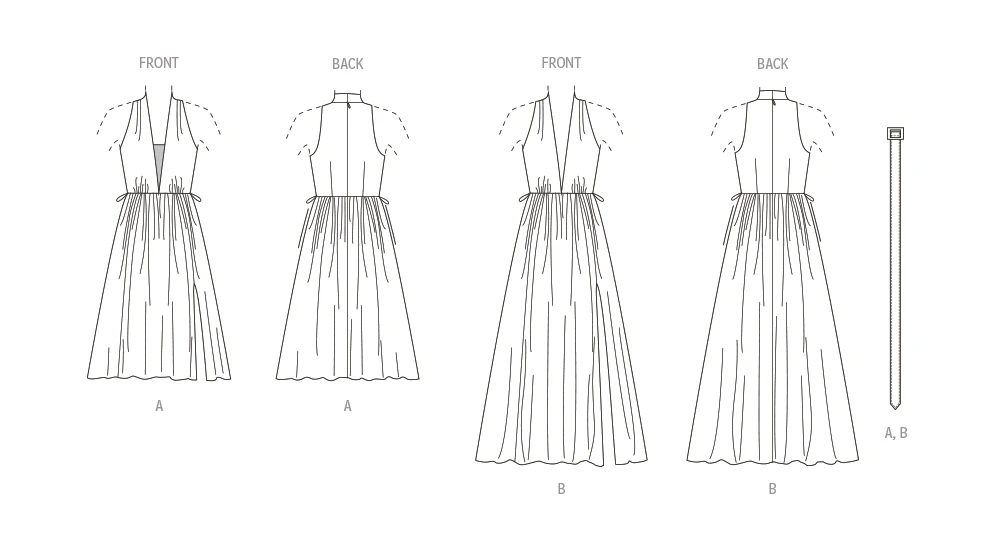 Vogue sewing pattern for Fitted, lined dress with length variations has side front seams on skirt, thread loops, side seam pockets, invisible back zipper, left side front slit and baby hems. View A has contrast inset. Dress includes matching belt with covered buckle.