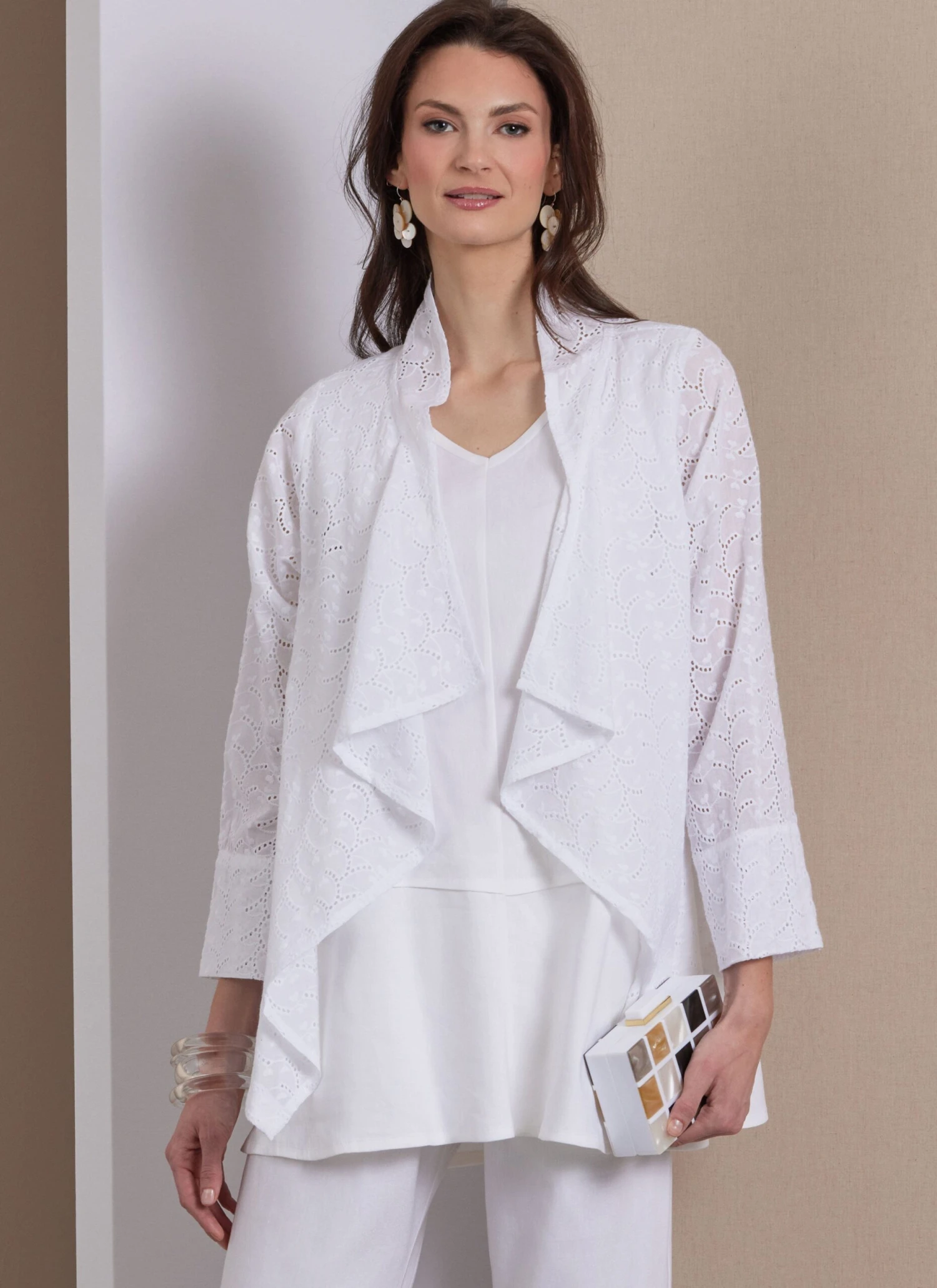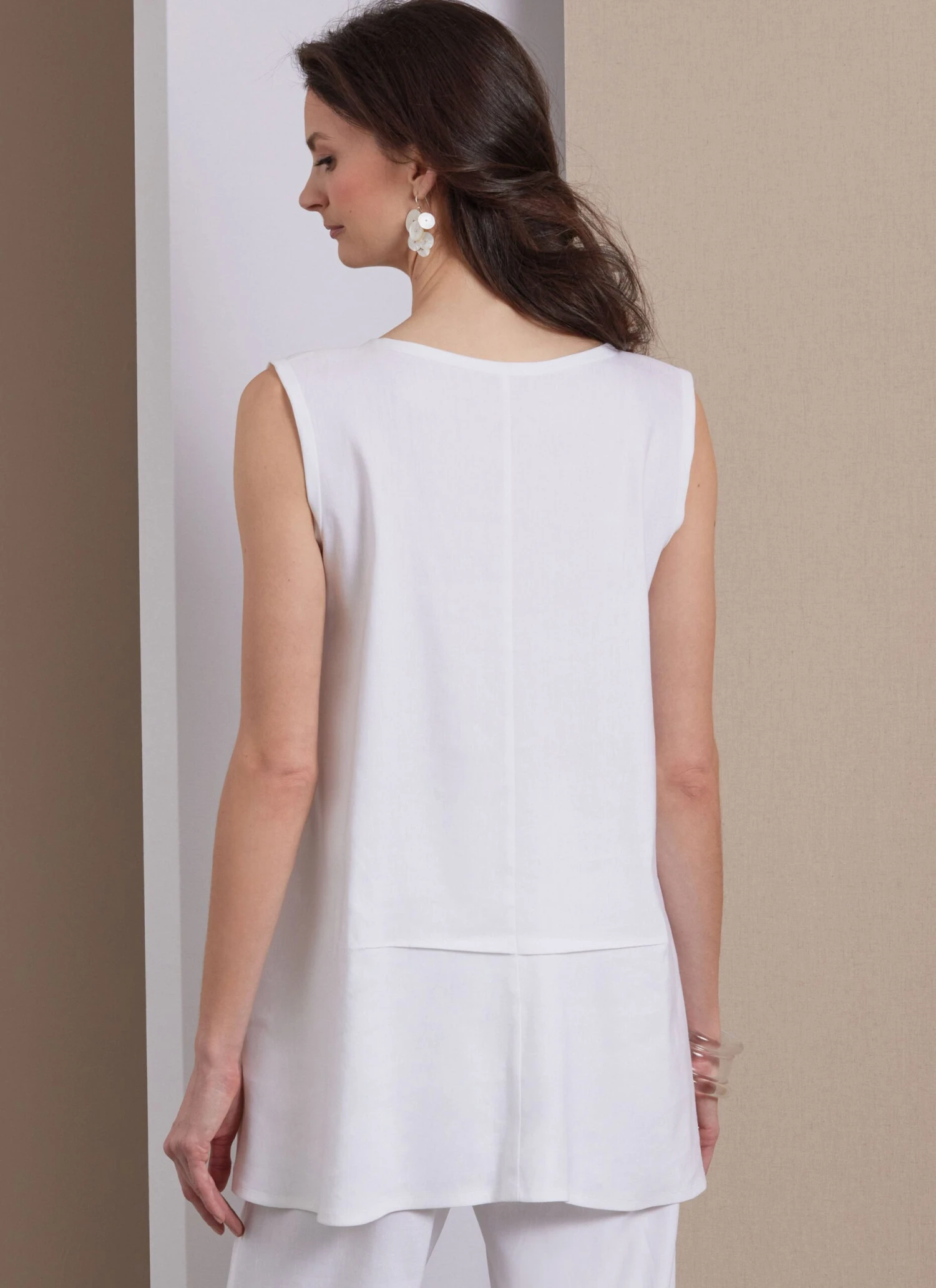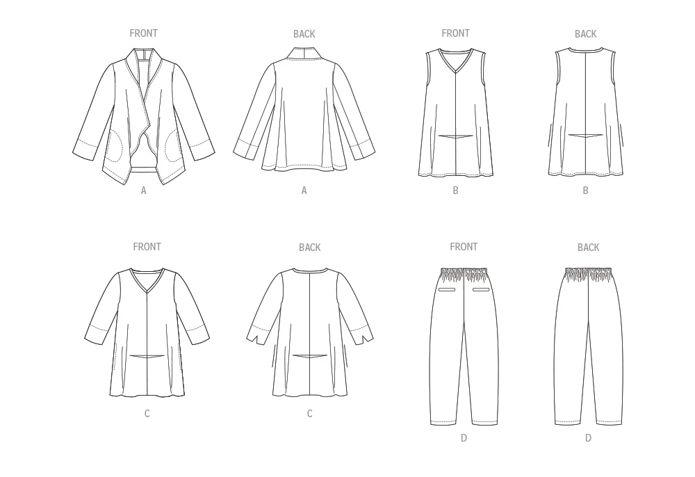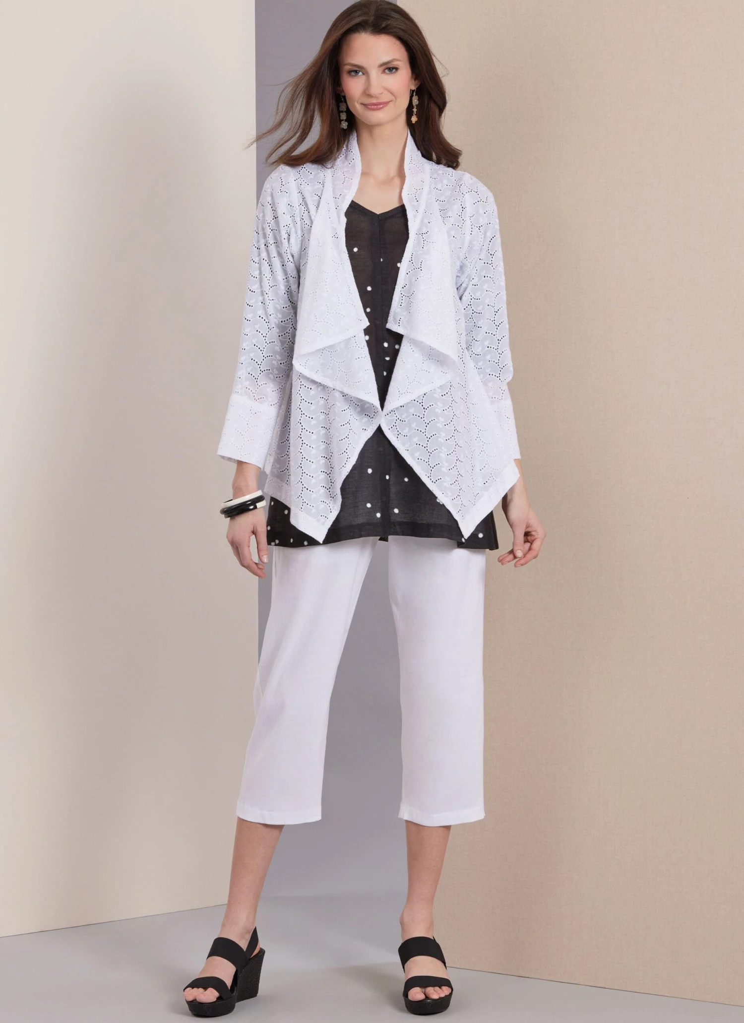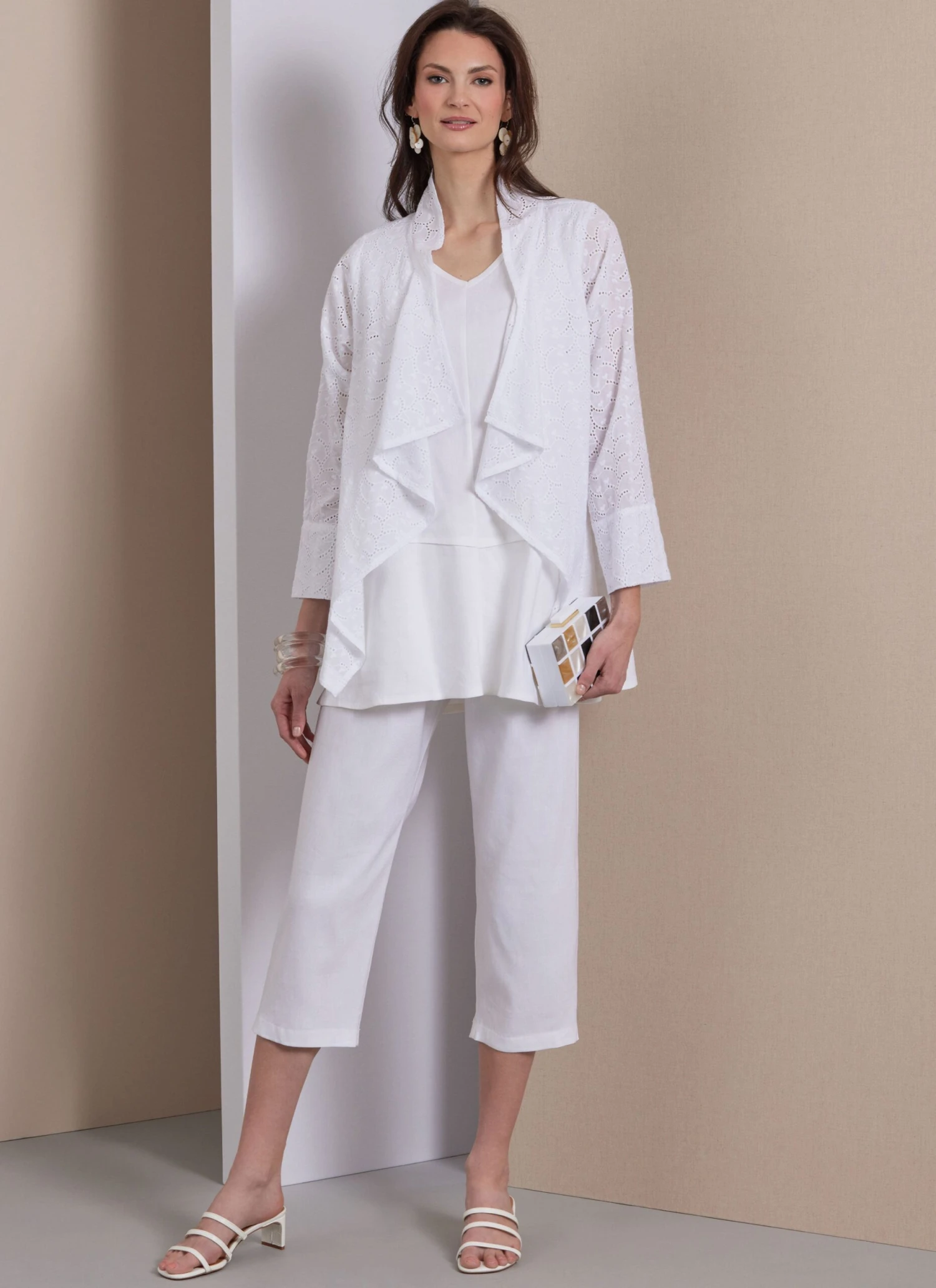 Vogue sewing pattern for Loose-fitting jacket has in-seam stitched down pockets optional, bias facings, stitched or hand sewn hem and set-in two piece sleeves with deep turn back hem facings. Tunics have sleeveless or 3/4 sleeve length option with self-facings, in-seam floating pockets, bias binding and front darts. Pull-on pants has oval pockets.