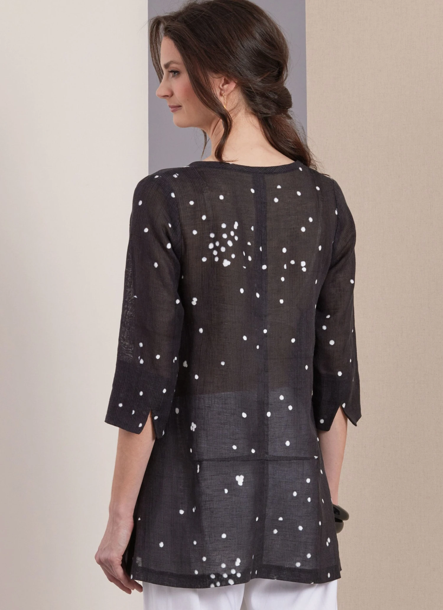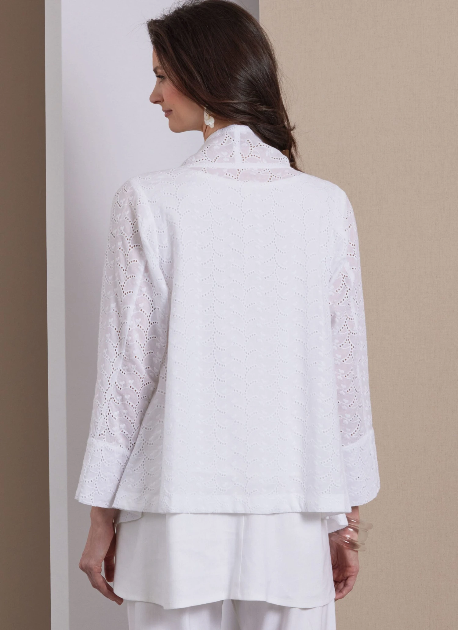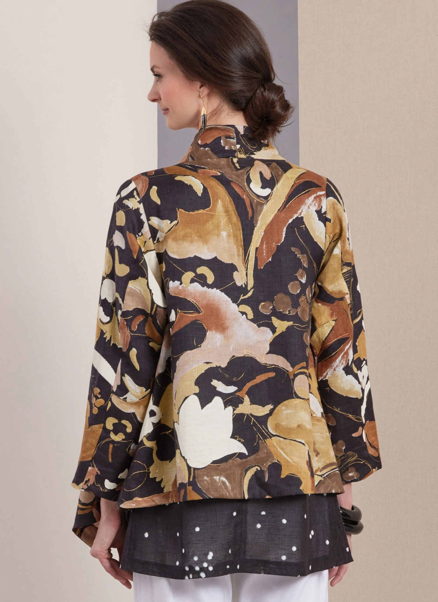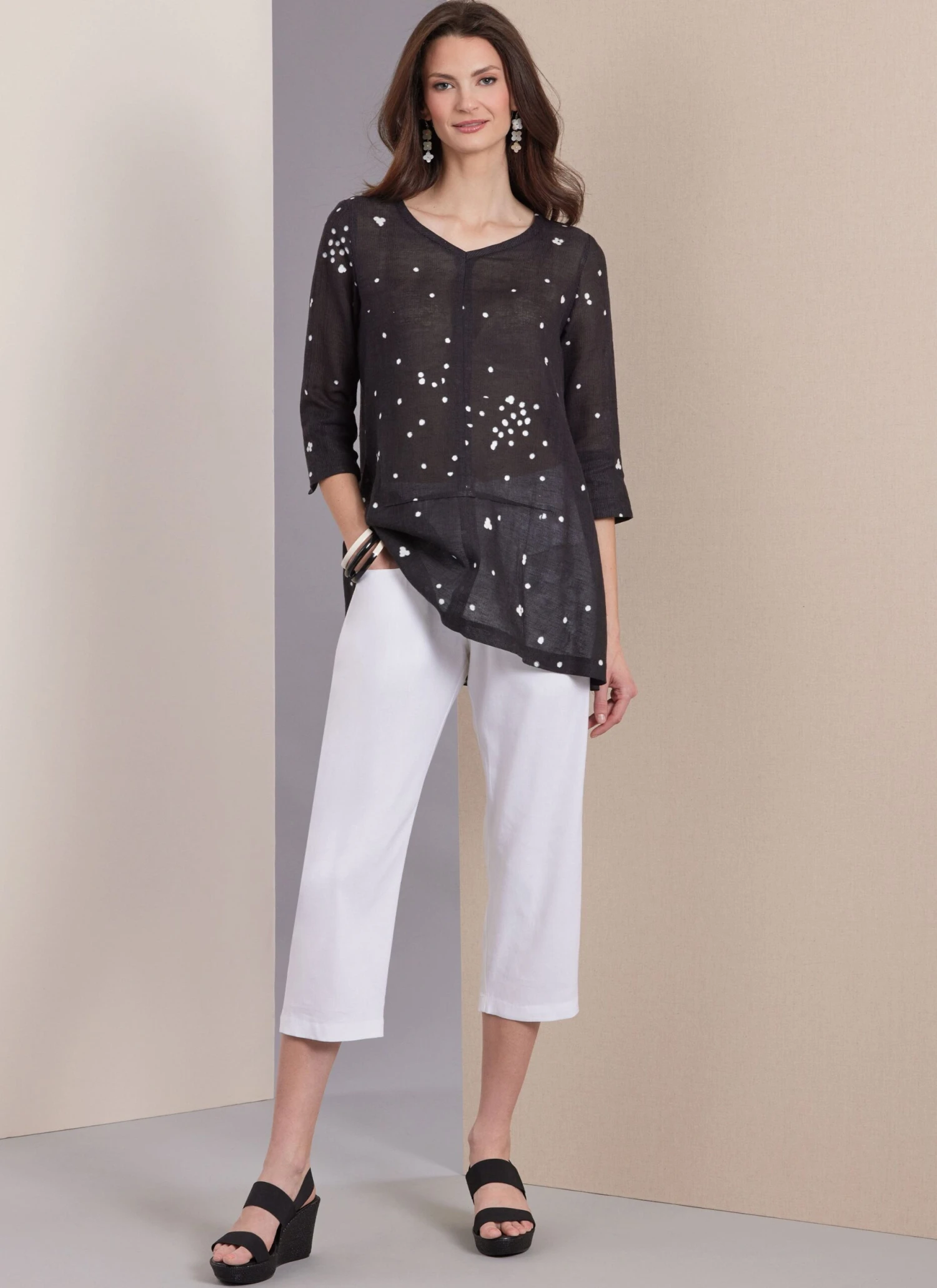Vogue sewing pattern for Loose-fitting jacket has in-seam stitched down pockets optional, bias facings, stitched or hand sewn hem and set-in two piece sleeves with deep turn back hem facings. Tunics have sleeveless or 3/4 sleeve length option with self-facings, in-seam floating pockets, bias binding and front darts. Pull-on pants has oval pockets.