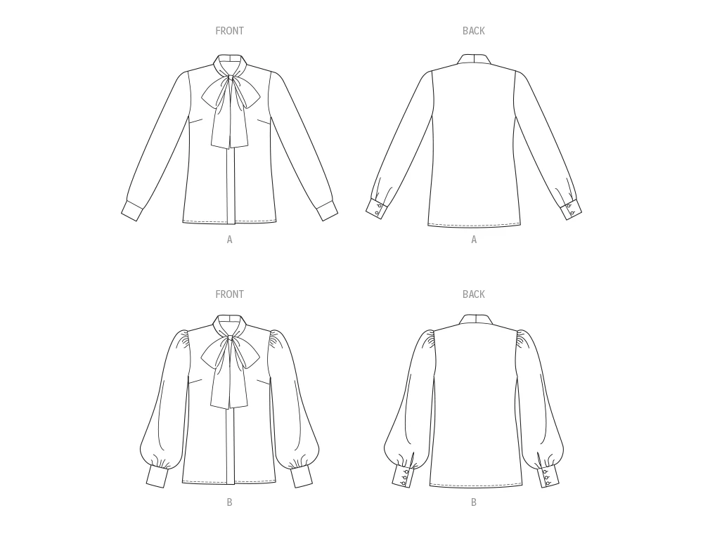 Vogue Sewing Pattern for Semi-fitted blouse has collar that extends into tie ends, concealed front button closure, long set-in sleeves with continuous lap, button cuffs and stitched hems. View A has tapered sleeves. View B has bishop sleeves with gathers.