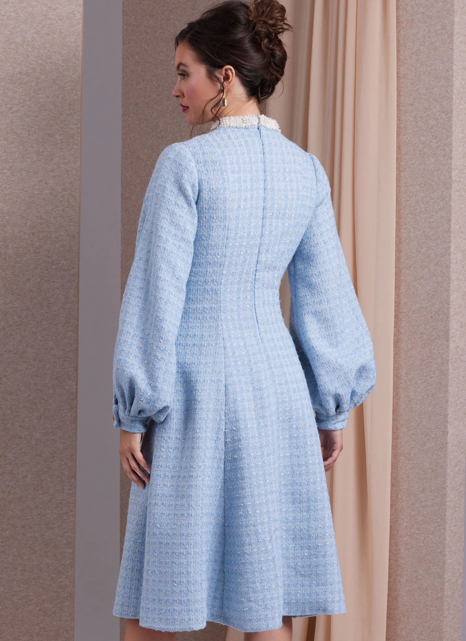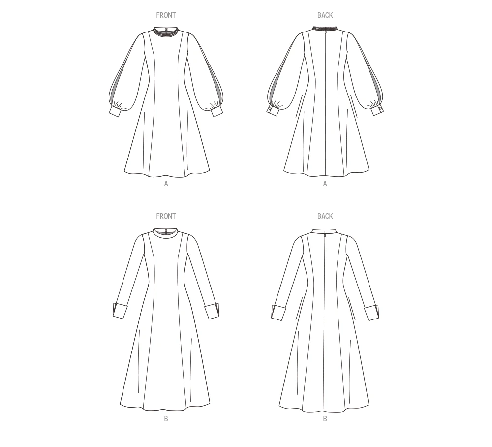 Fit and flare dresses are lined and underlined. Close fitting through bust and waist, have bias stand collar, princess seams, side seam pockets, invisible back zipper, hook and eye closure and invisible hem. View A has long two piece bishop sleeves, split so lining shows, ending in button cuffs, purchased trim on collar. View B has long sleeves with cuffs.