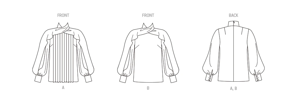 Semi-fitted, twist neck top has long bishop sleeves, sleeve opening with continuous lap, button cuffs, bust darts and baby hems. View A has a pleated front. View B has a plain front.