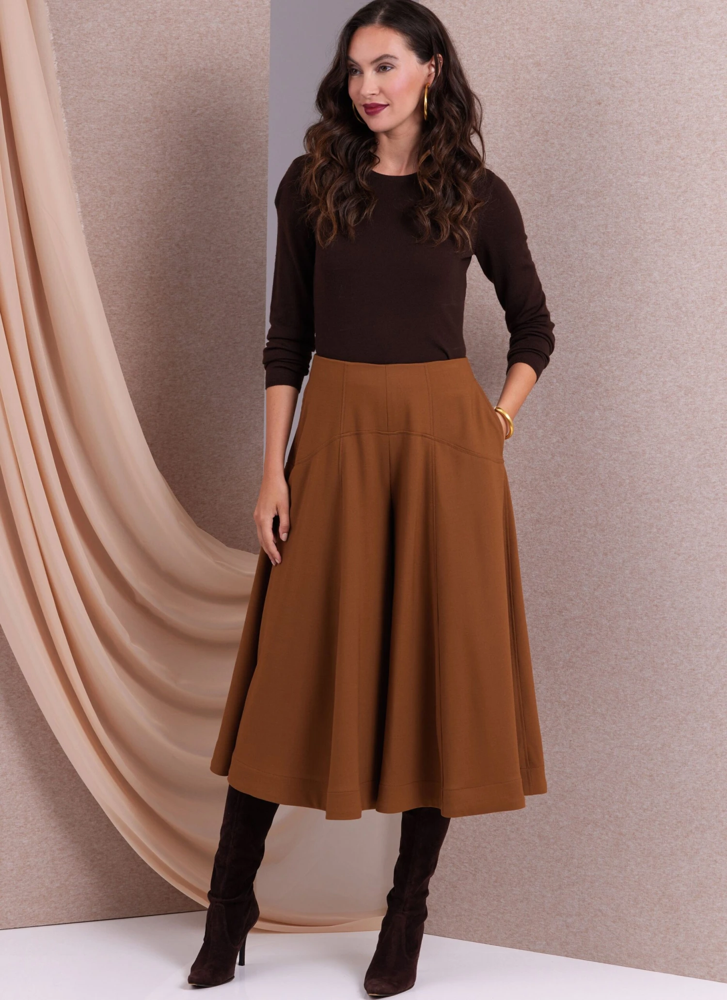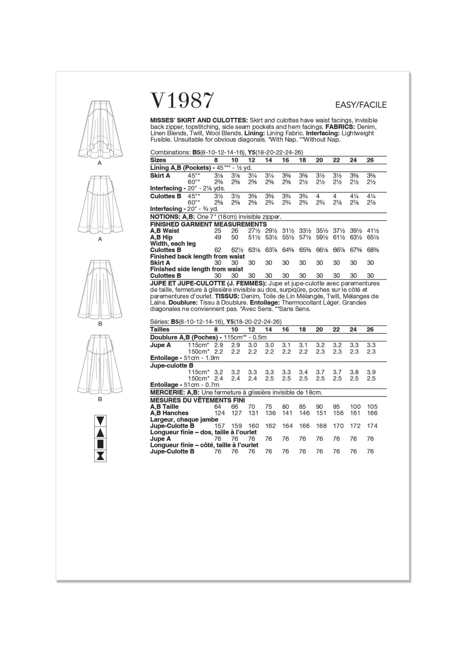 Skirt and culottes have waist facings, invisible back zipper, topstitching, side seam pockets and hem facings.