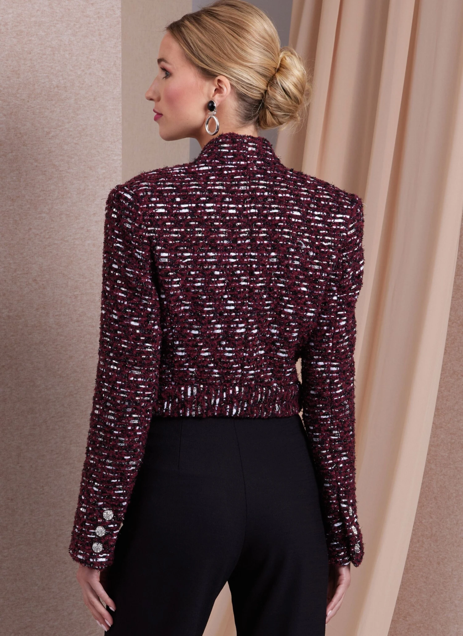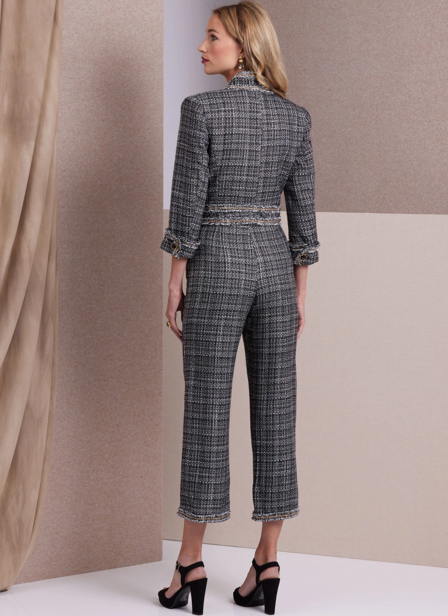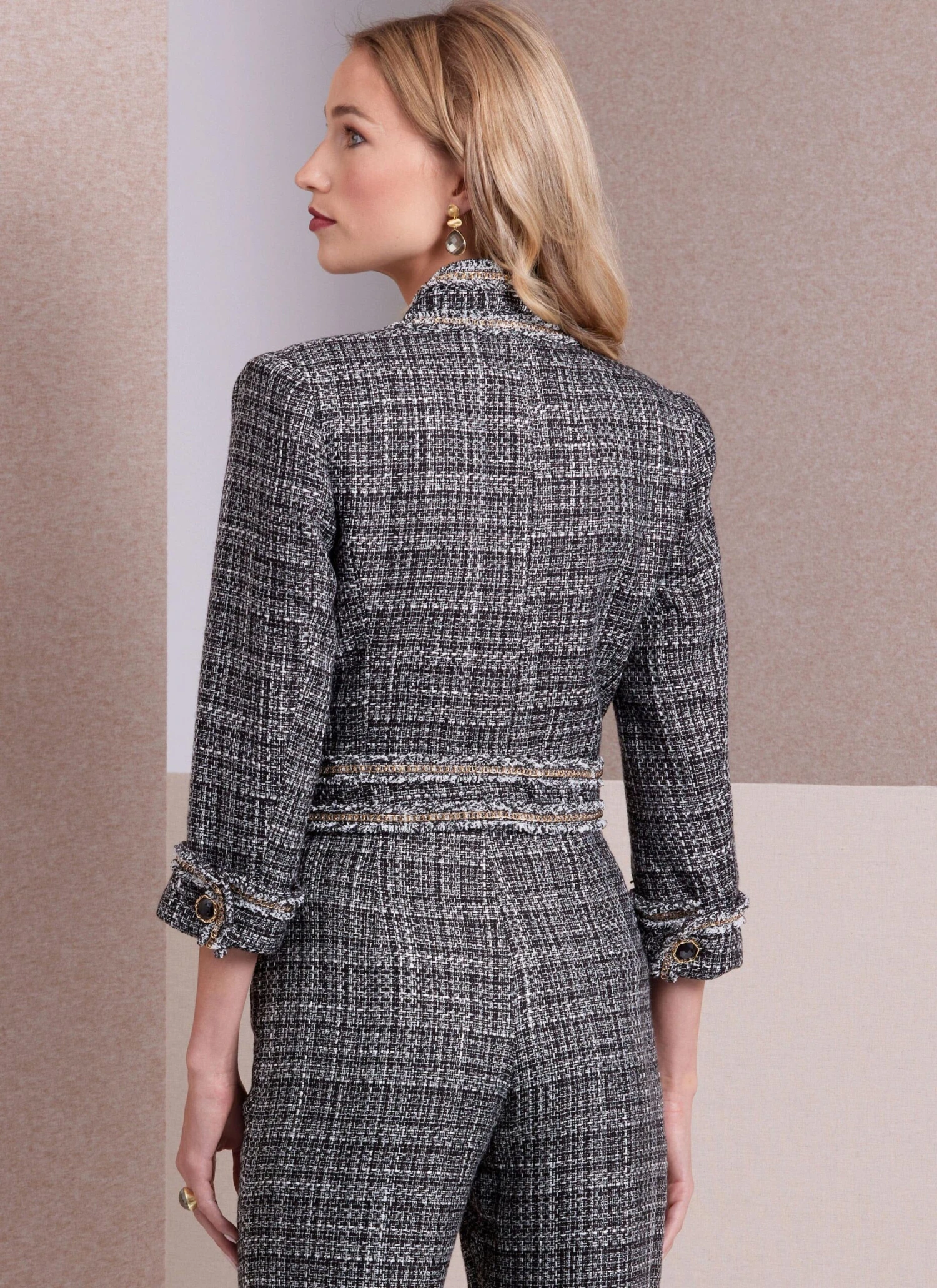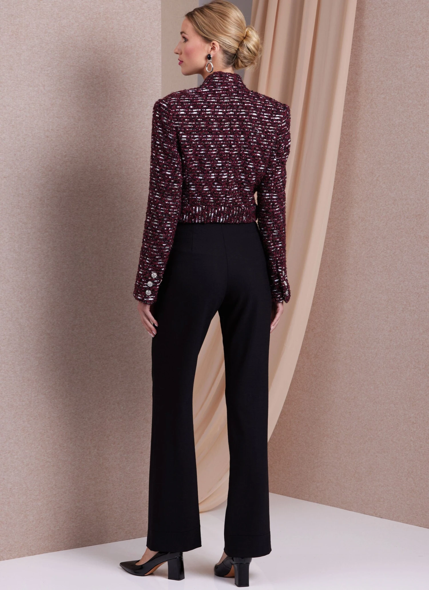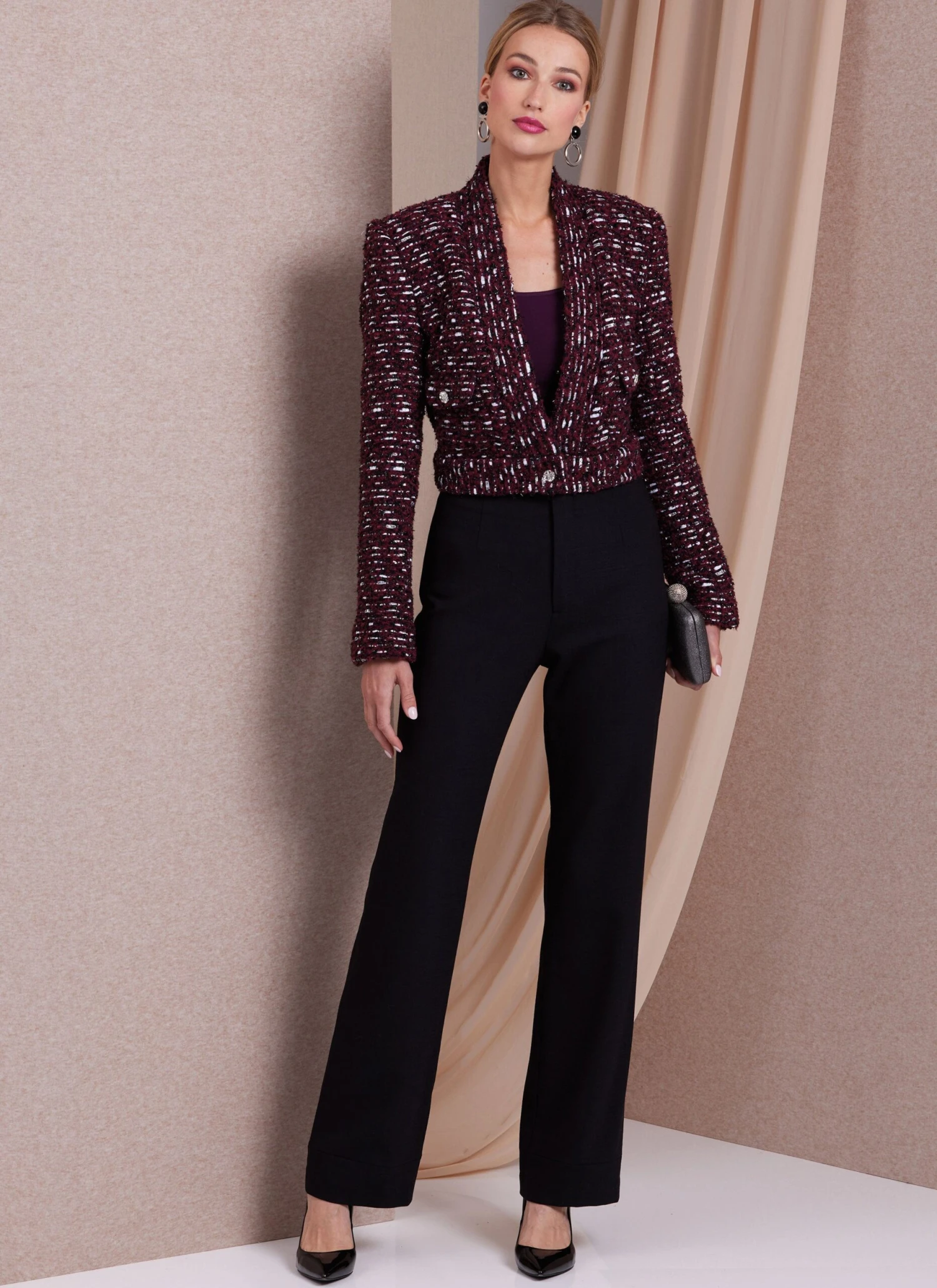 Fitted, cropped jackets have extended shoulders, shoulder pads and two-piece sleeves. View A has below elbow length sleeves and patch pockets. View B has long sleeves with working vents and patch pockets with flaps. Fitted pants have fly front zipper with hook and bar closure, waist facings, waist darts and invisible hem. Views A and C have purchased trim.