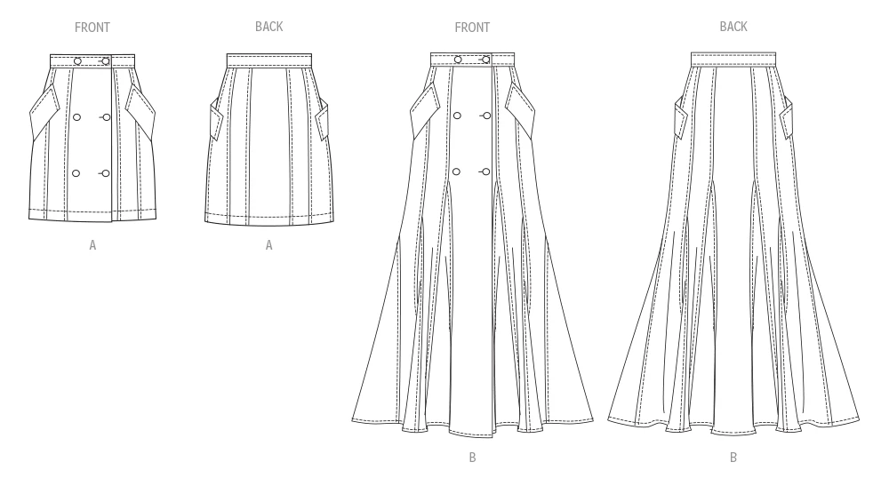 Fitted, unlined skirt has double-breasted front button opening, welt pockets and topstitching. View A slim fit skirt is short length. View B floor length skirt is flared and has godets. Both skirts have stitched hems.