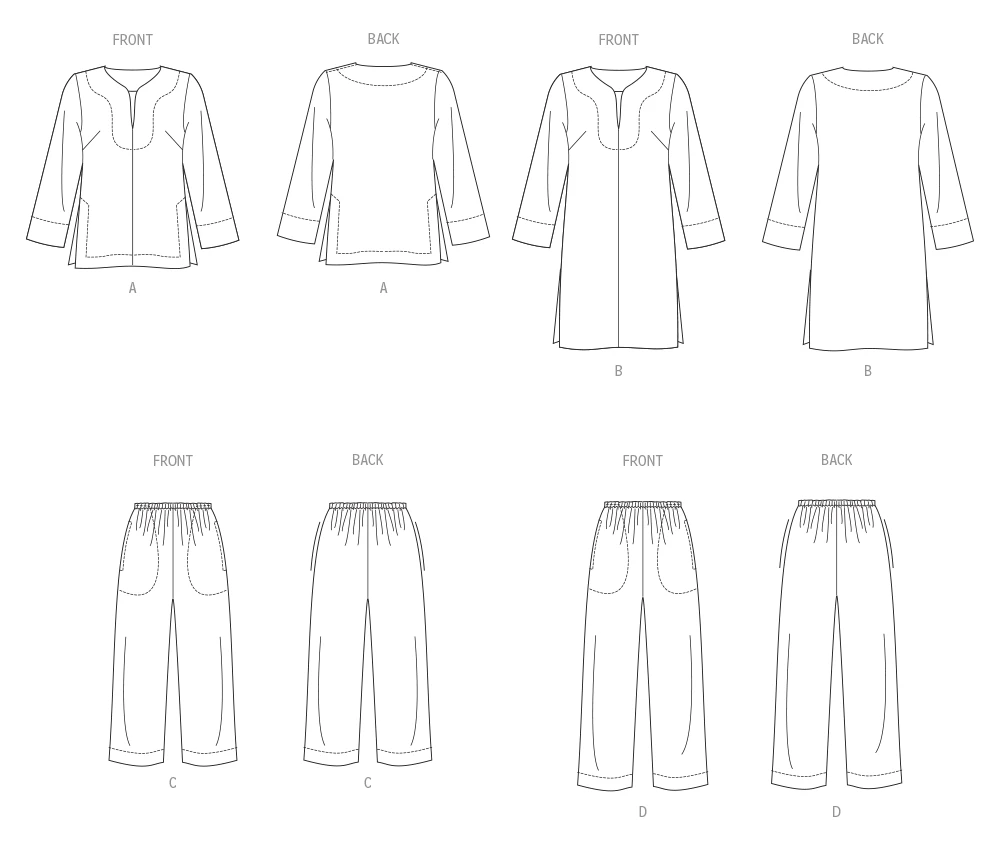 Create your own relaxed and stylish loungewear with easy to sew Vogue Pattern 2019 designed by Marcy Tilton. These loose-fitting tops feature a split neck, sewn down neck facings, set-in sleeves, bust darts, and side slits. The elastic waist pants come with side seam pockets and various length options. Choose from View A top with a topstitched hem and vents. This pattern is rated as EASY, and fabrics such as cotton, crepe de chine, drapey rayon challis, and silk/poly charmeuse are suggested. Lightweight fusible interfacing recommended