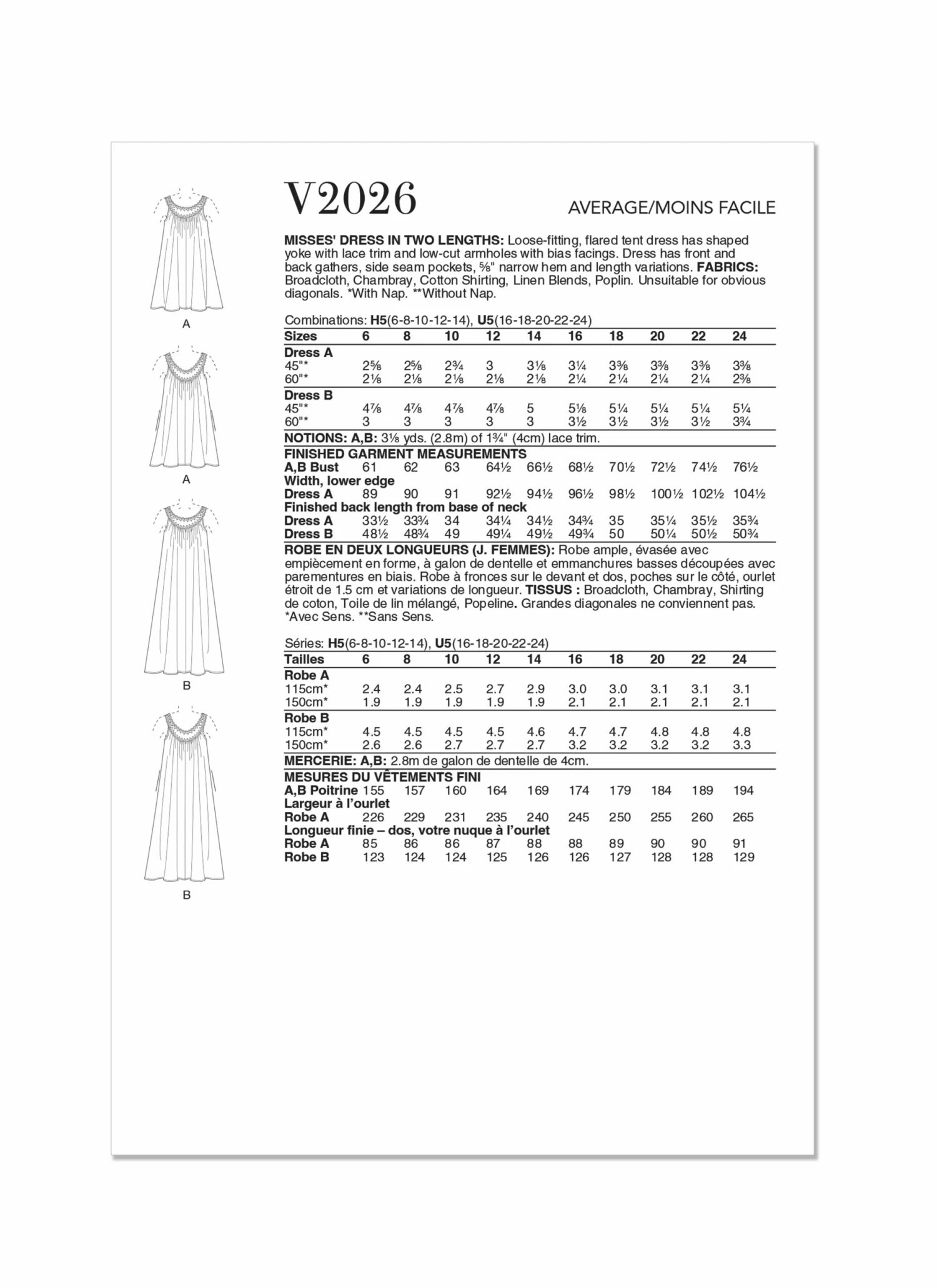 Vogue pattern for Loose-fitting, flared tent dress has shaped yoke with lace trim and low-cut armholes with bias facings. Dress has front and back gathers, side seam pockets, 5/8″ narrow hem and length variations.