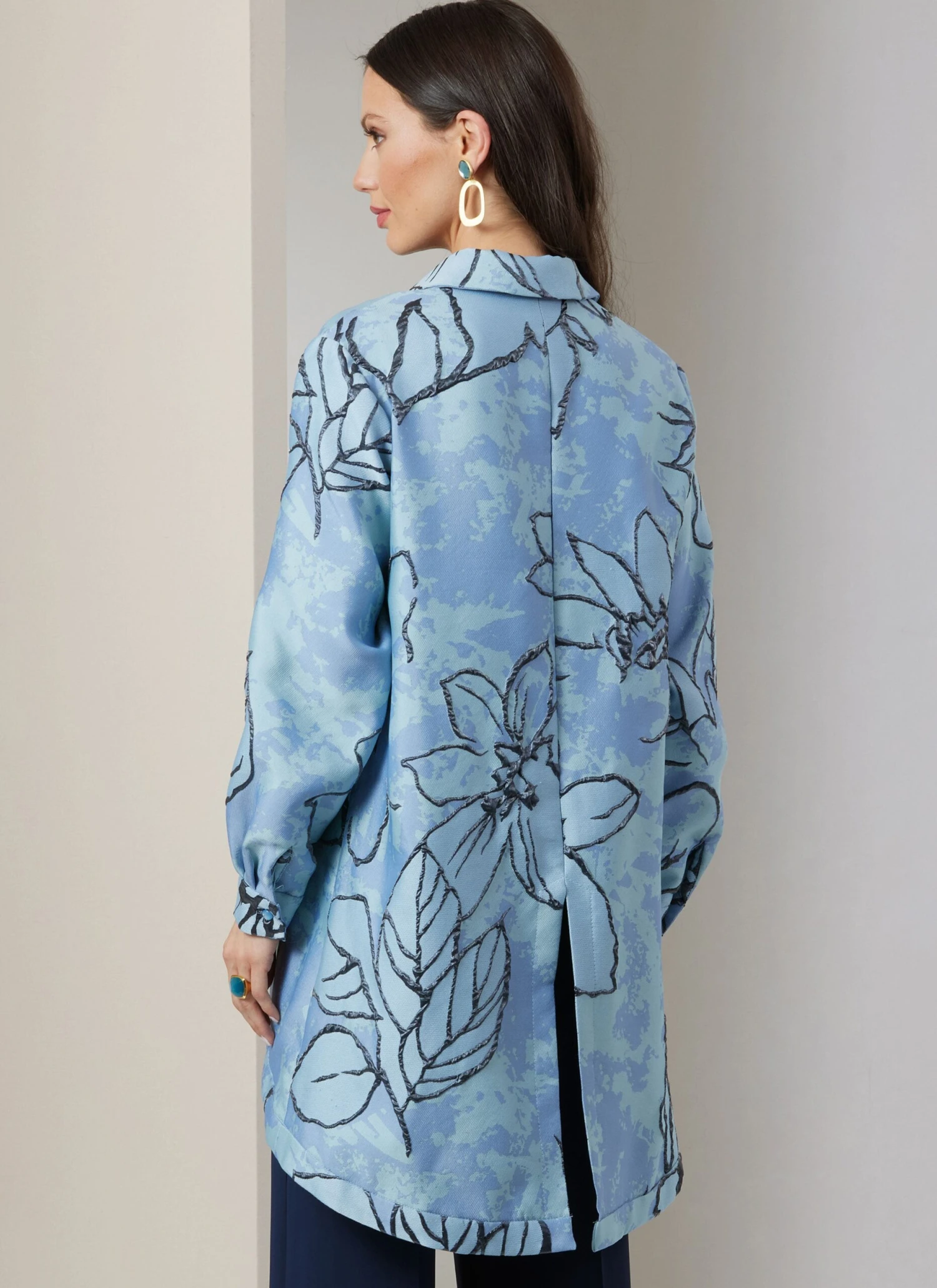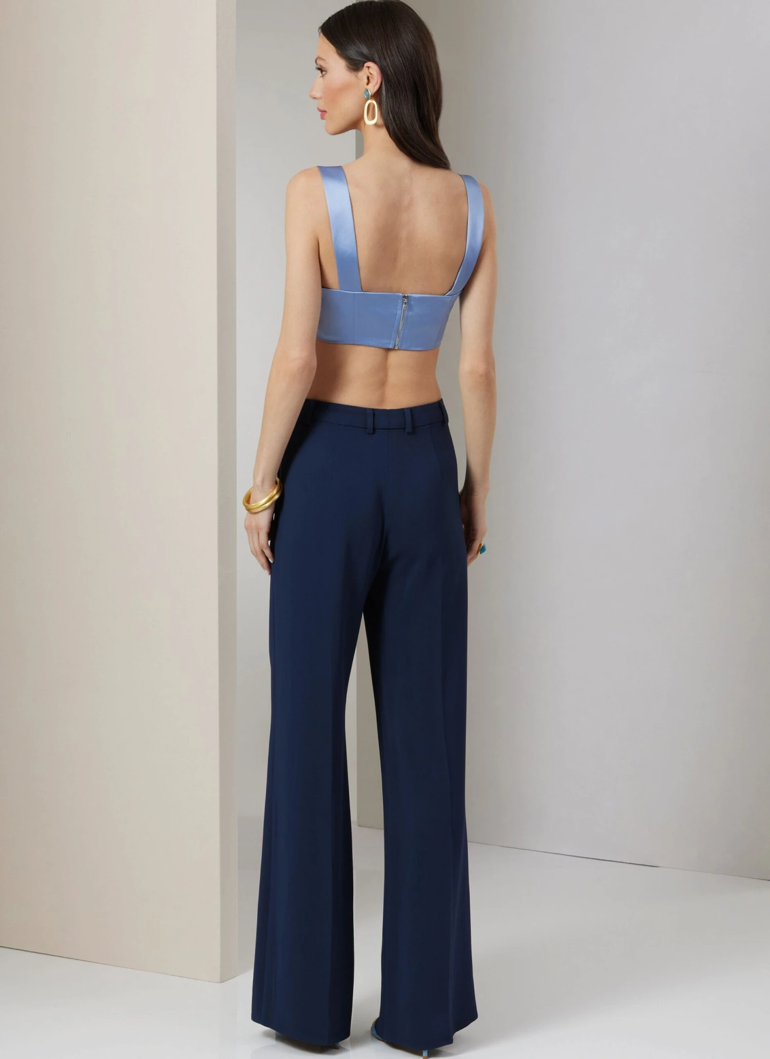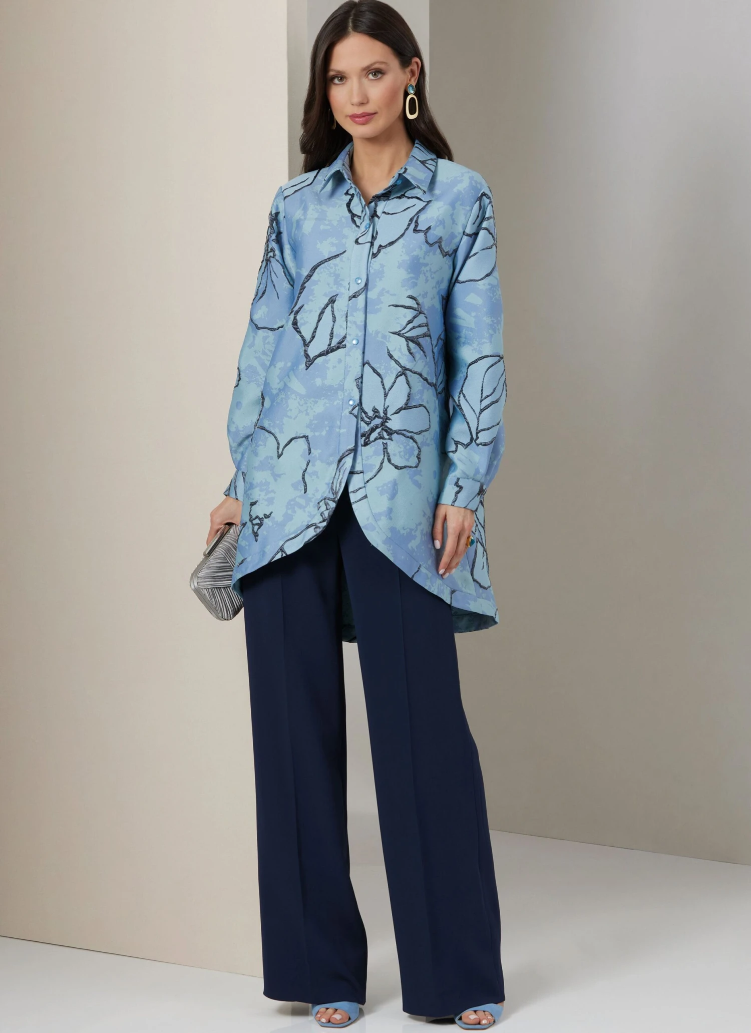 Vogue pattern for Loose fitting shirt has shaped hem bands, back hem slit, pointed collar, collar band, long set-in sleeves with button cuffs and placket opening. Close-fitting lined top, fully interfaced, has straps and exposed separating back zipper. Wide leg pants, semi-fitted through hip, have side front pockets, fly front and belt carriers.