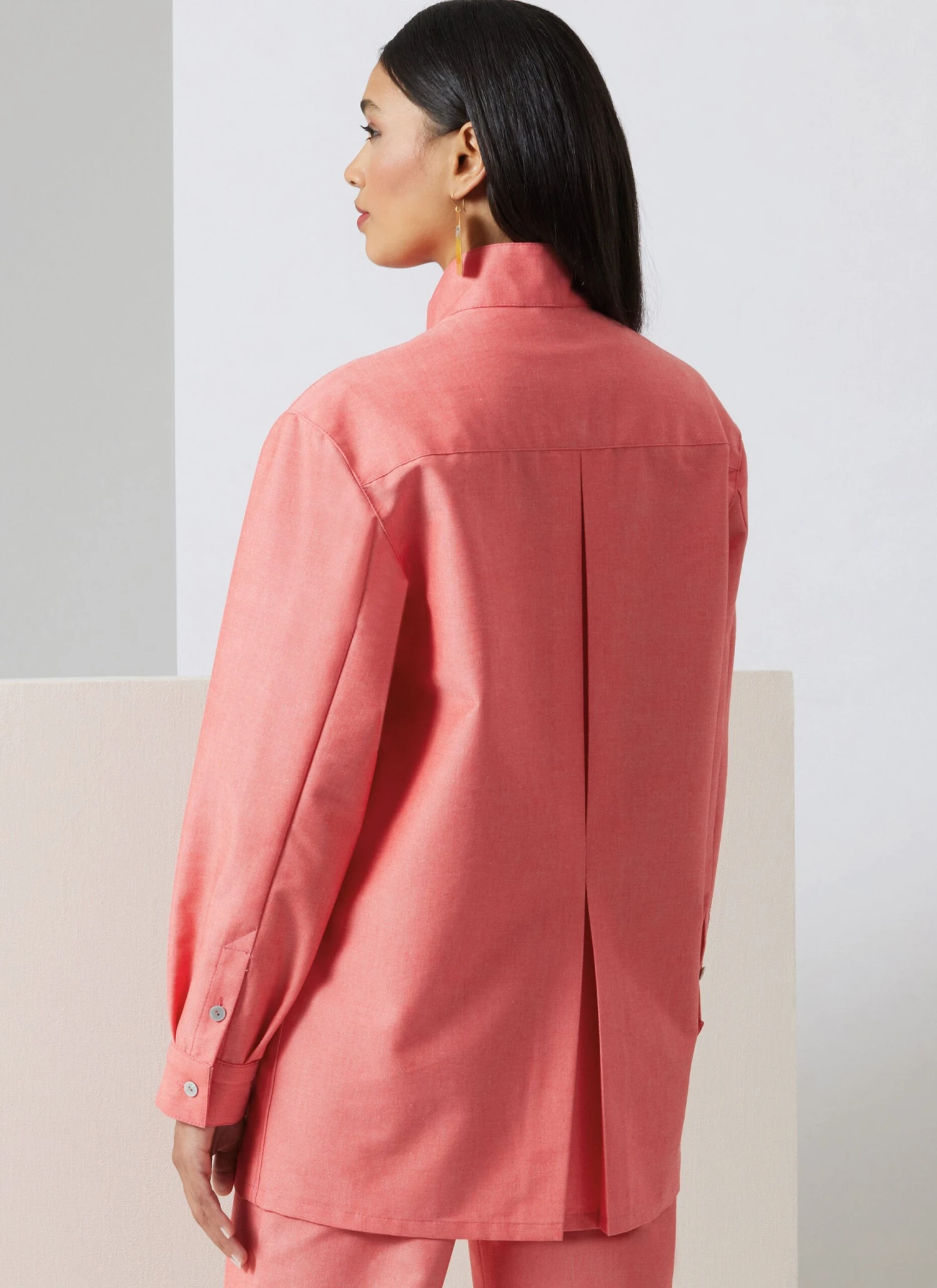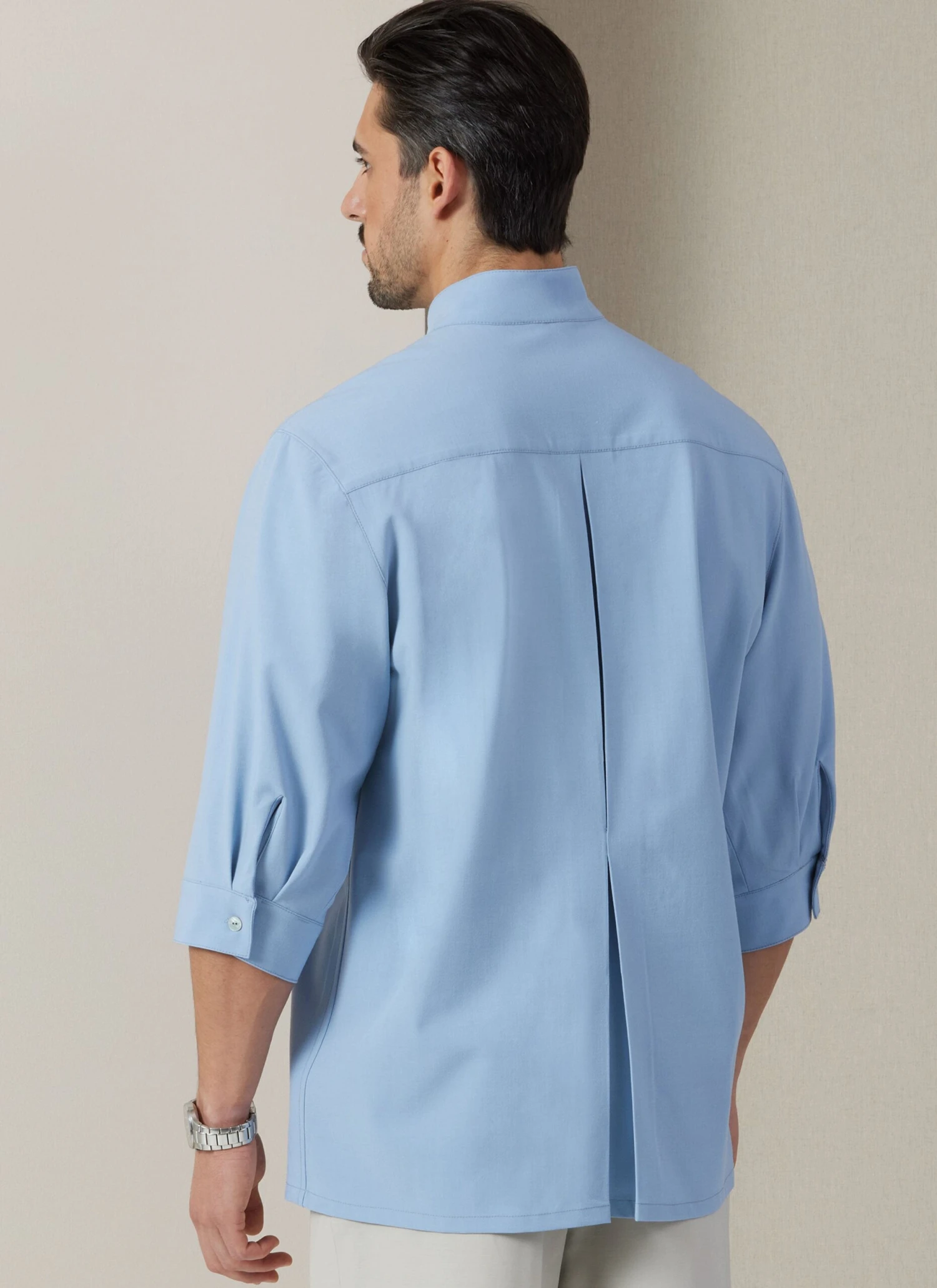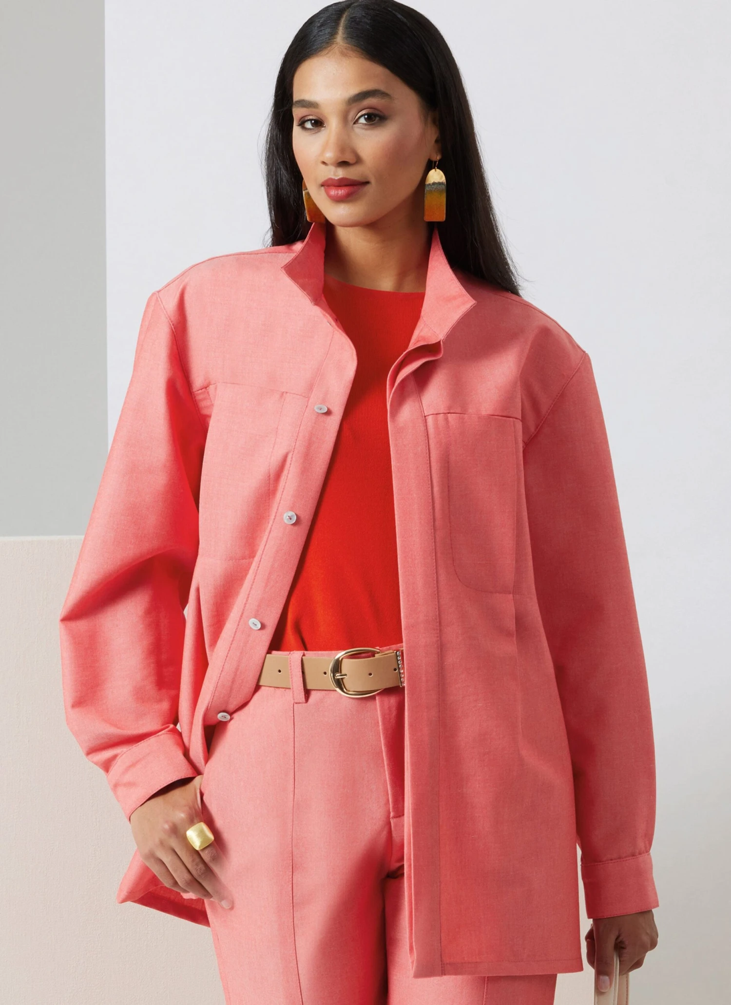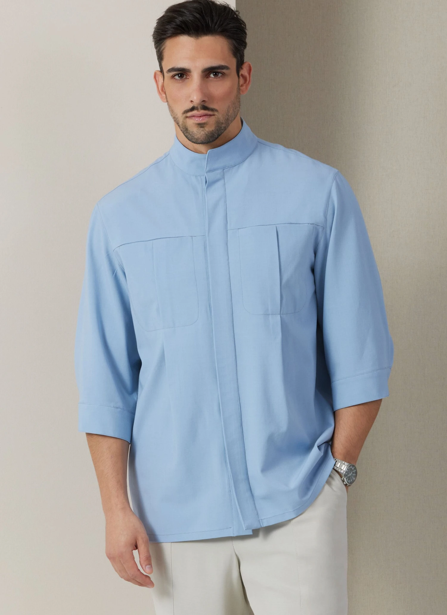 Vogue pattern for Semi-fitted shirts have stand-up collar, extended shoulders, concealed front button closure, in-seam front pockets, front pleat detail and pressed inverted pleat on back. View A has below elbow length sleeves, button cuffs and continuous lap opening. View B has long two-piece sleeves with in-seam opening and button cuffs. Pants have waist facings, side front pockets, side front seams, fly front zipper with hook and bar closure, belt loops and back welt pockets.