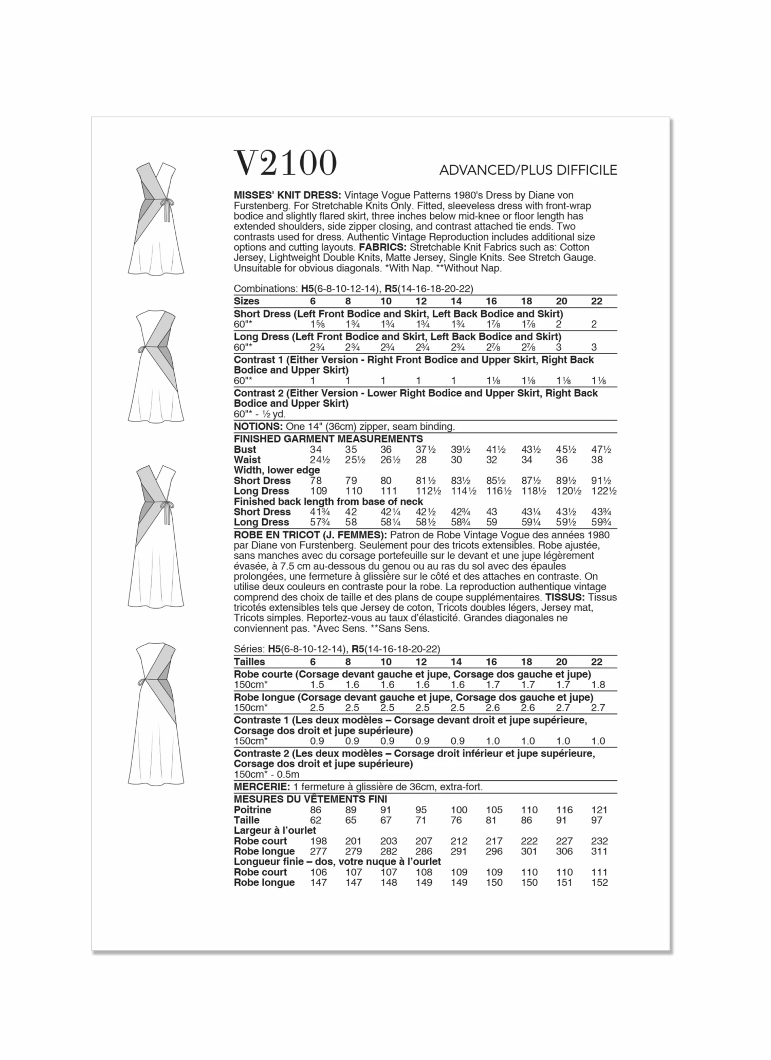 Sewing pattern for Vintage Vogue Patterns 1980’s Dress by Diane von Furstenberg. For Stretchable Knits Only. Fitted, sleeveless dress with front-wrap bodice and slightly flared skirt, 3 inches below mid-knee or floor length has extended shoulders, side zipper closing, and contrast attached tie ends. Two contrasts used for dress. Authentic Vintage Reproduction includes additional size options and cutting layouts.