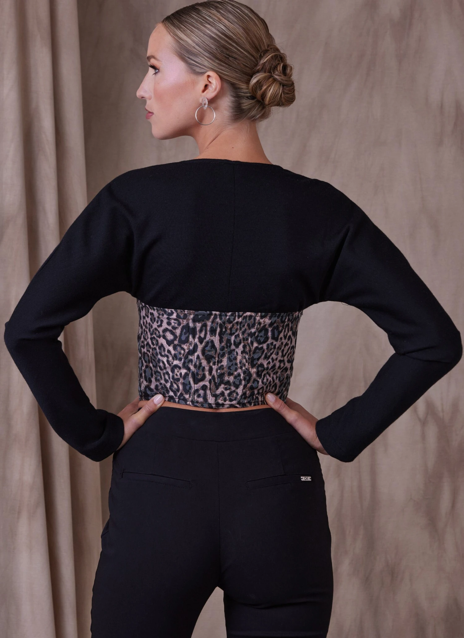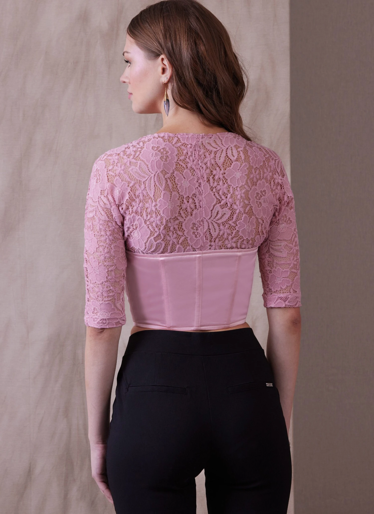 Lined, close-fitting corset top has fully interfaced body, boning, sweetheart neckline, hook and eye front closure, and contrast knit. View A has above elbow length sleeves. View B has long sleeves. Separate pattern pieces are included for cup sizes A, B, C, D.