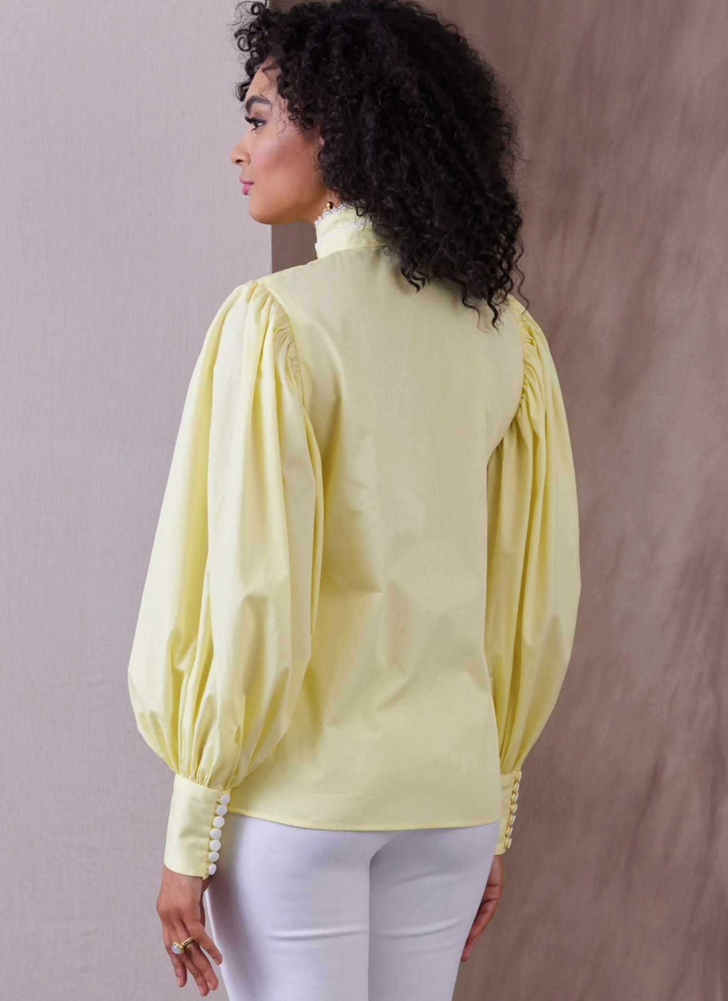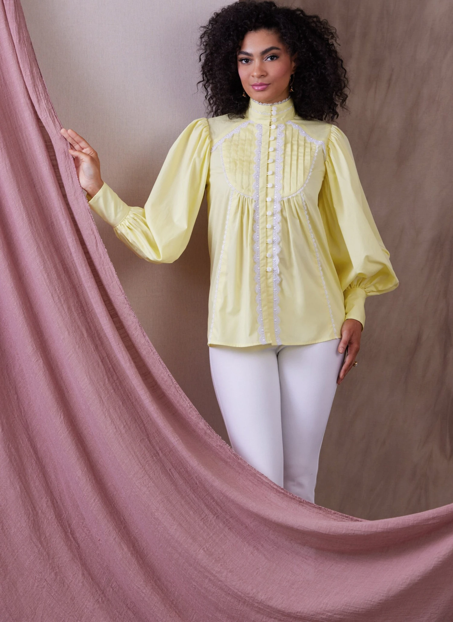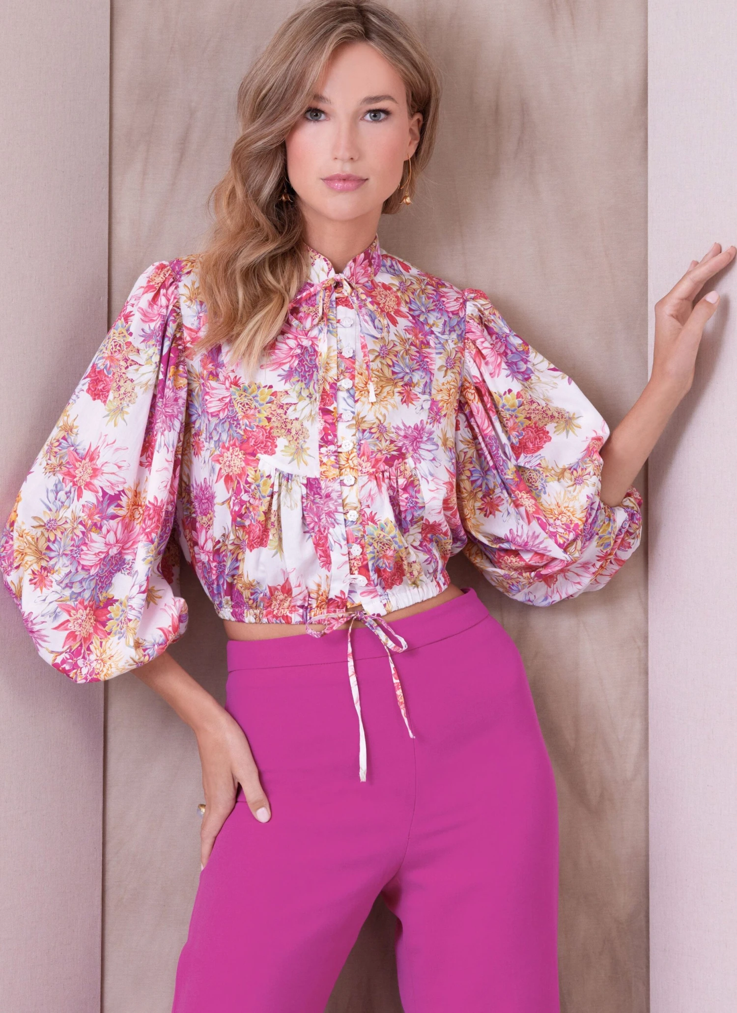 Loose-fitting top has gathered sleeves, and button with bias loop front closure. View A is cropped and has elastic waist, front ties, and three-quarter sleeves with elastic hems. View B has long sleeves, cuffs with button and bias loop closure, continuous lap opening, and lace trim.
