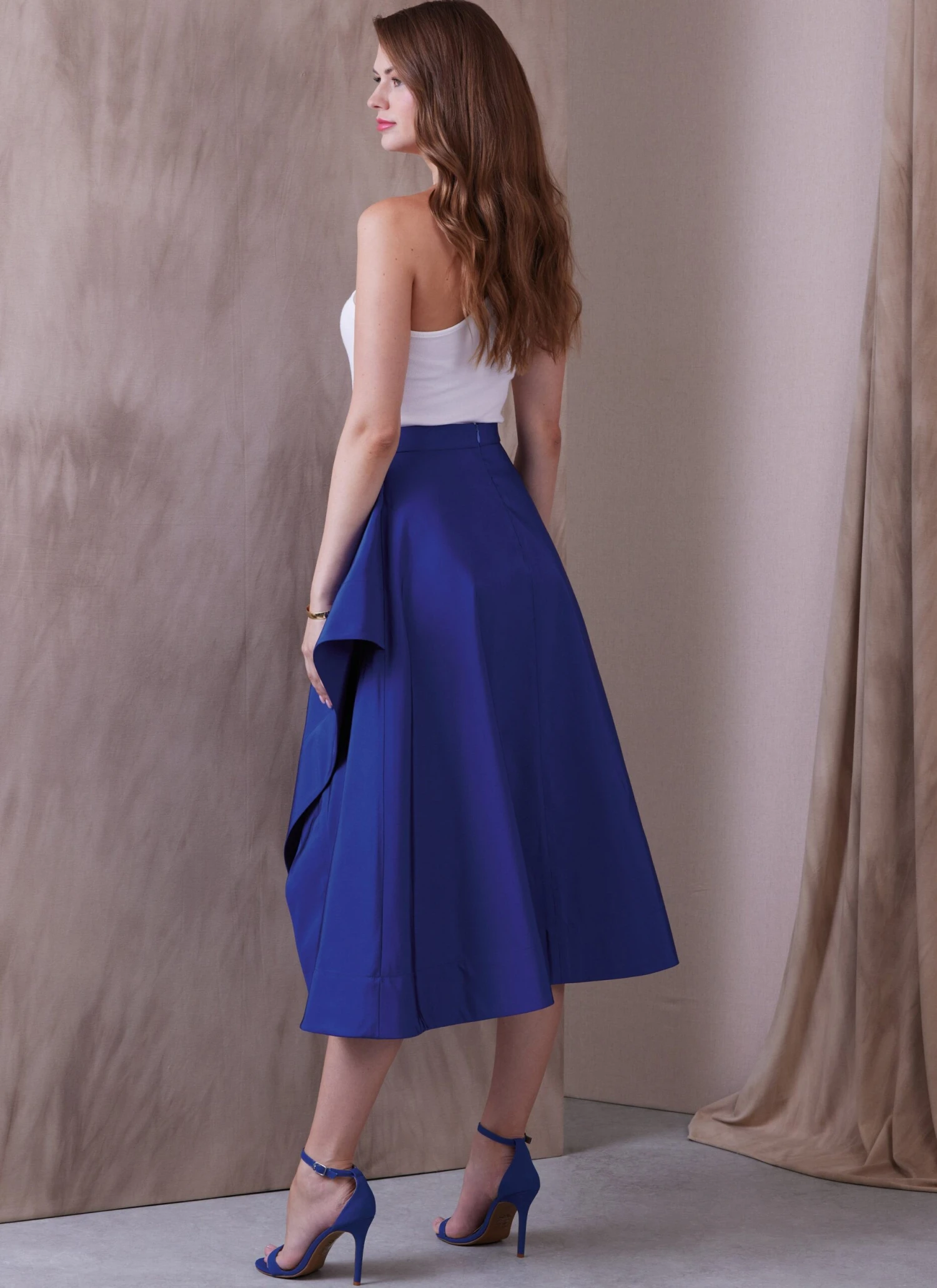 Full asymmetric skirt cut cross grain has draped side split, faced hem, waistband, invisible back zipper, and length variations.